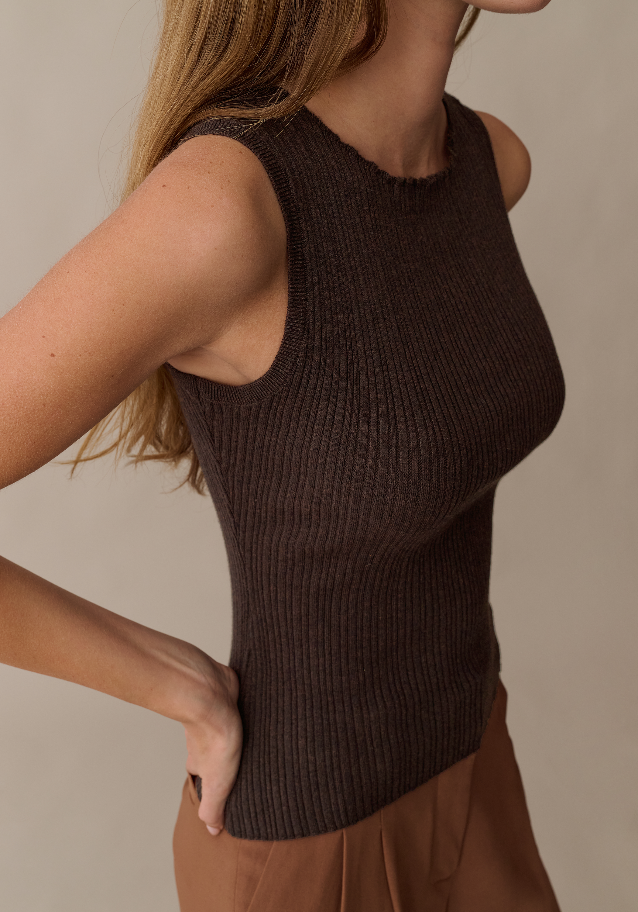The Nina Top strikes the perfect balance between comfort and style in a luxurious rich brown. Crafted from a ribbed knit with built-in stretch, it hugs your frame with a high neckline and sleek fitted cut that feels intentional.