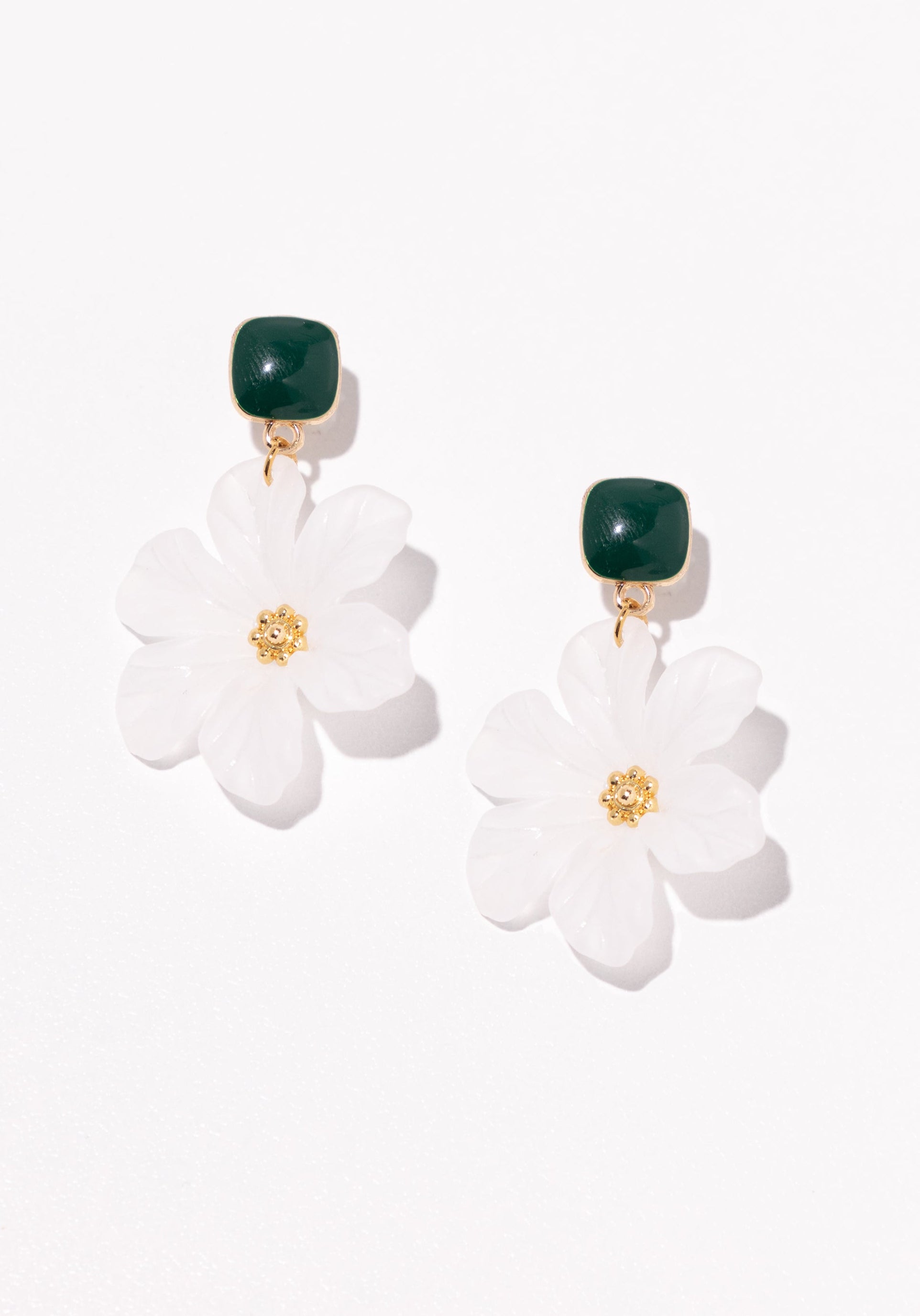 These Daisy Blossom Drop Earrings showcase light, delicate petals for a lifelike bloom that bring a natural elegance to your look. Highlighted by a gorgeous green stone stud setting, these statement earrings add the perfect finishing touch to your look.