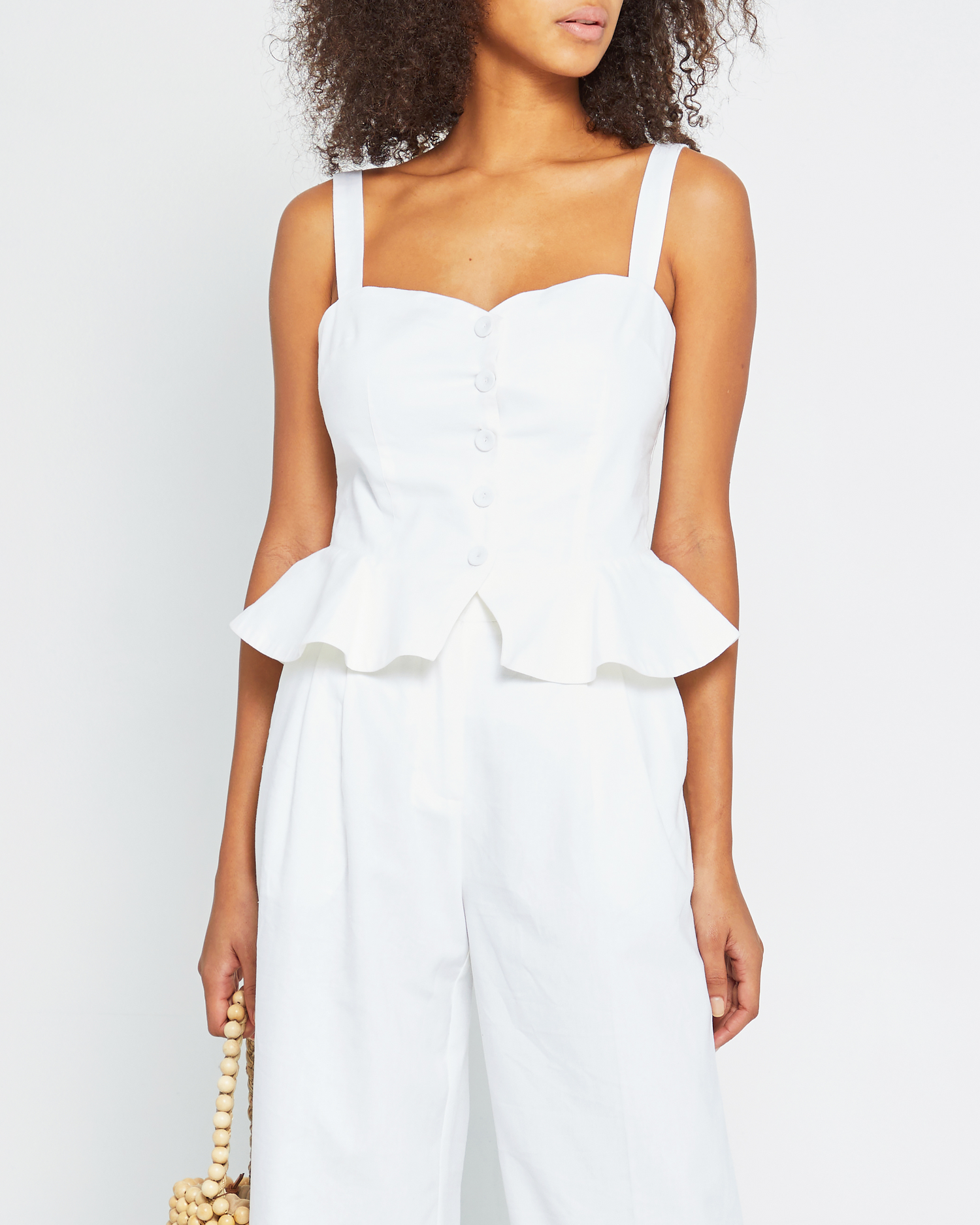The Gigi Top is crafted with carefully selected materials and features a classic peplum silhouette, sweetheart neckline, thick straps, and front buttons. The peplum design adds to the flattering silhouette, while the front buttons add a fun touch.