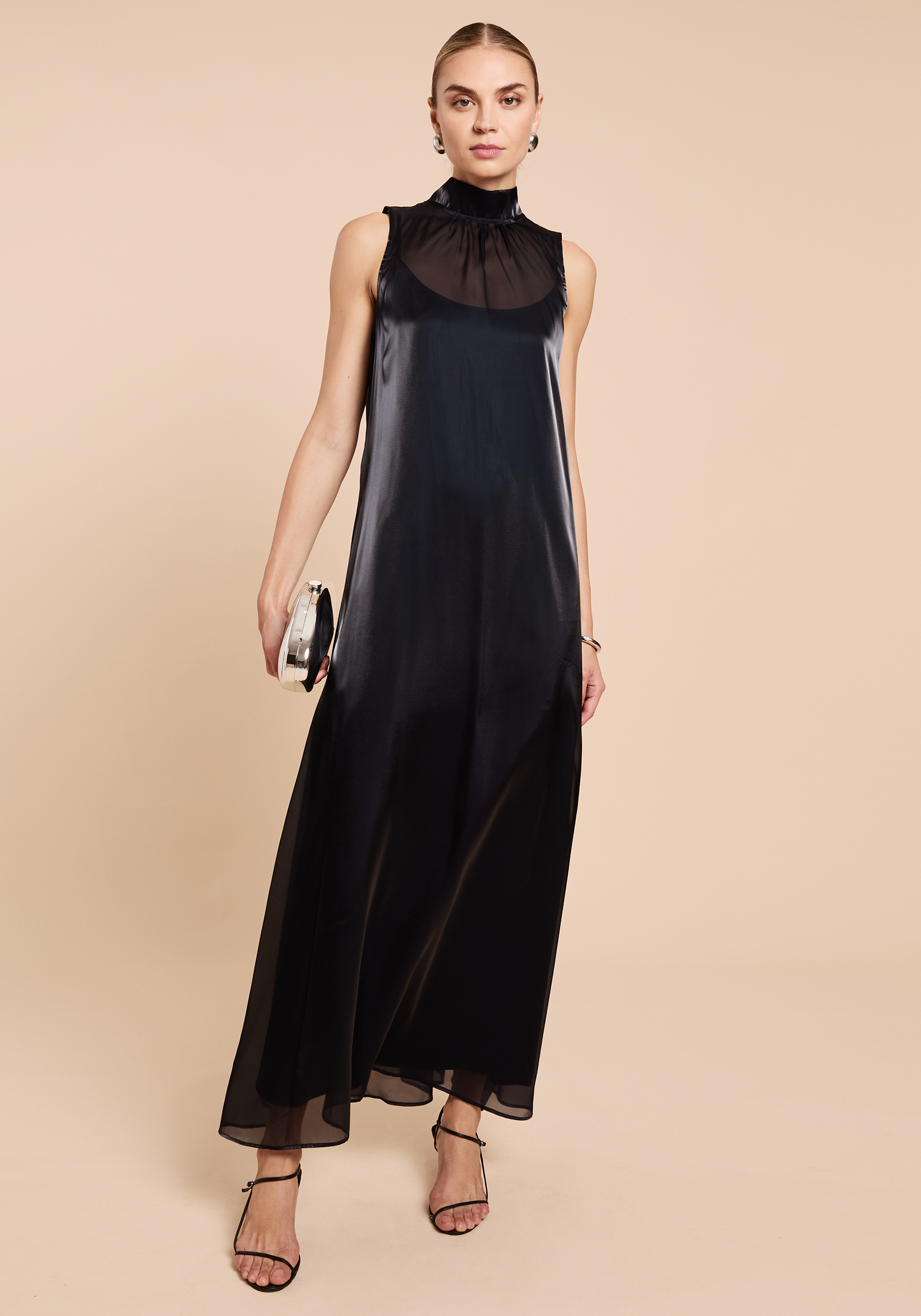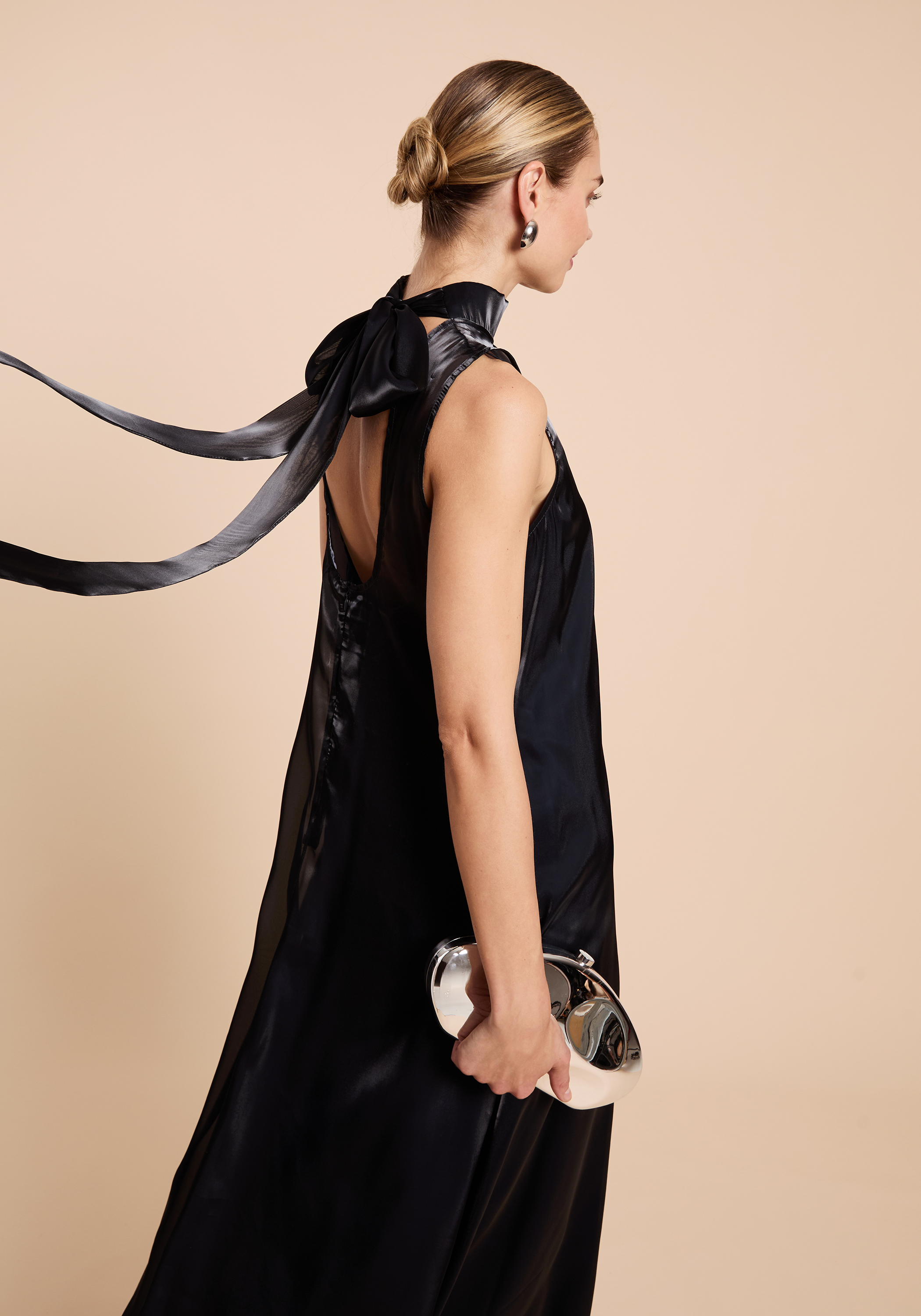 Expertly crafted, the Alette Dress features a stunning soft shine on a chic navy backdrop. Made with floaty organza, this dress offers an elegant high neckline and a delicate back bow detail, making it the perfect choice for any occasion. Add a touch of sophistication to your wardrobe with this must-have piece.