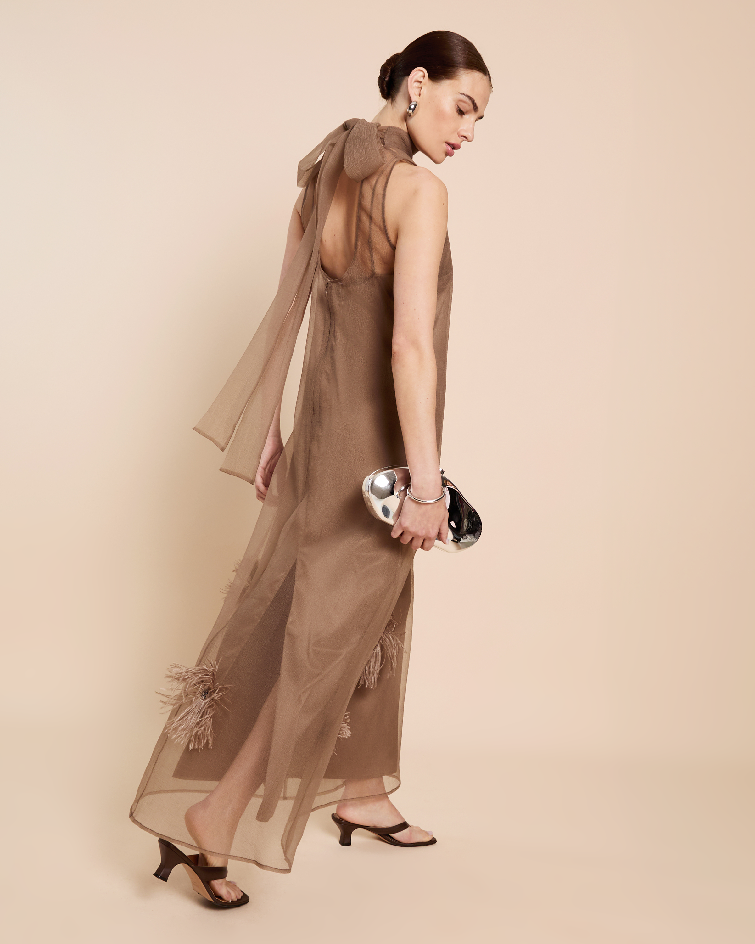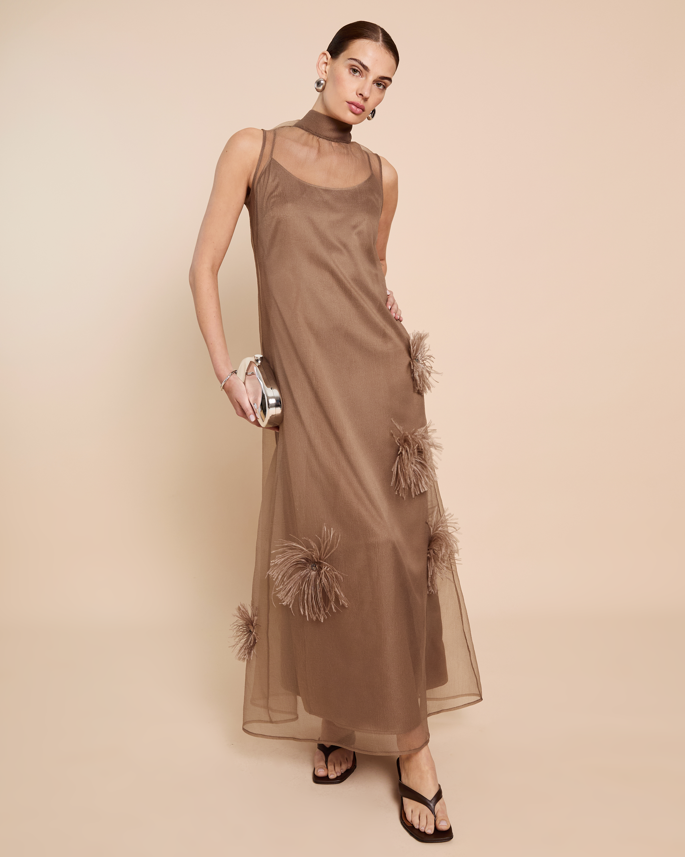 The Naia Dress features an elegant silhouette with a high neckline, crafted from airy organza in a warm brown hue. Its delicate feathered details add a playful touch, making it a sophisticated choice for special occasions.