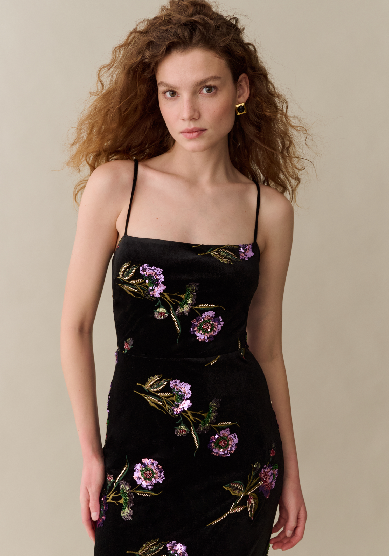 Crafted in plush velvet with delicately embroidered florals, this gown brings rich texture and romance to a timeless silhouette. Slim straps and a softly fitted bodice elongate the frame, while the straight skirt offers sleek, effortless movement. An elegant choice for seasonal events, it blends classic glamour with a modern, feminine feel.