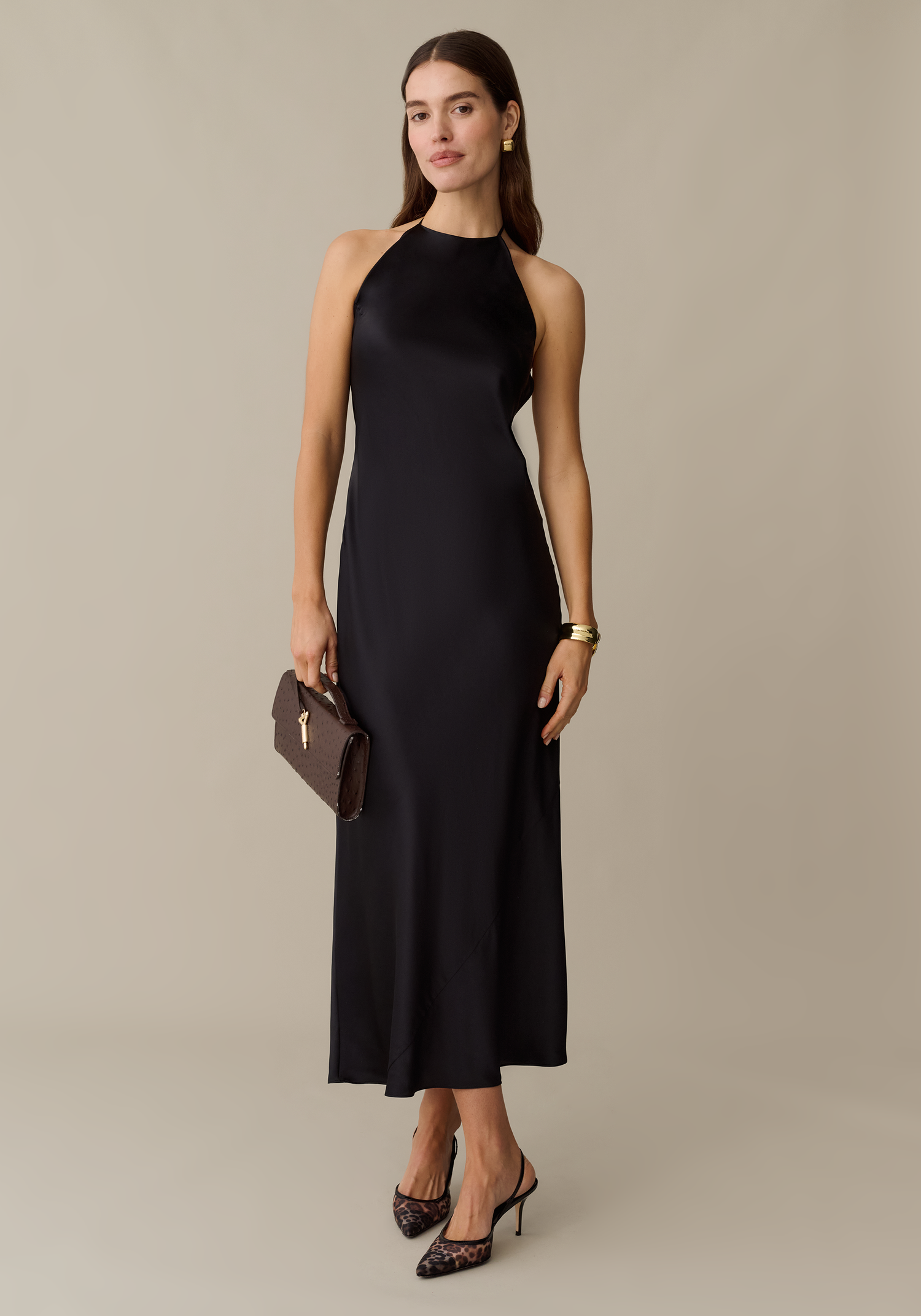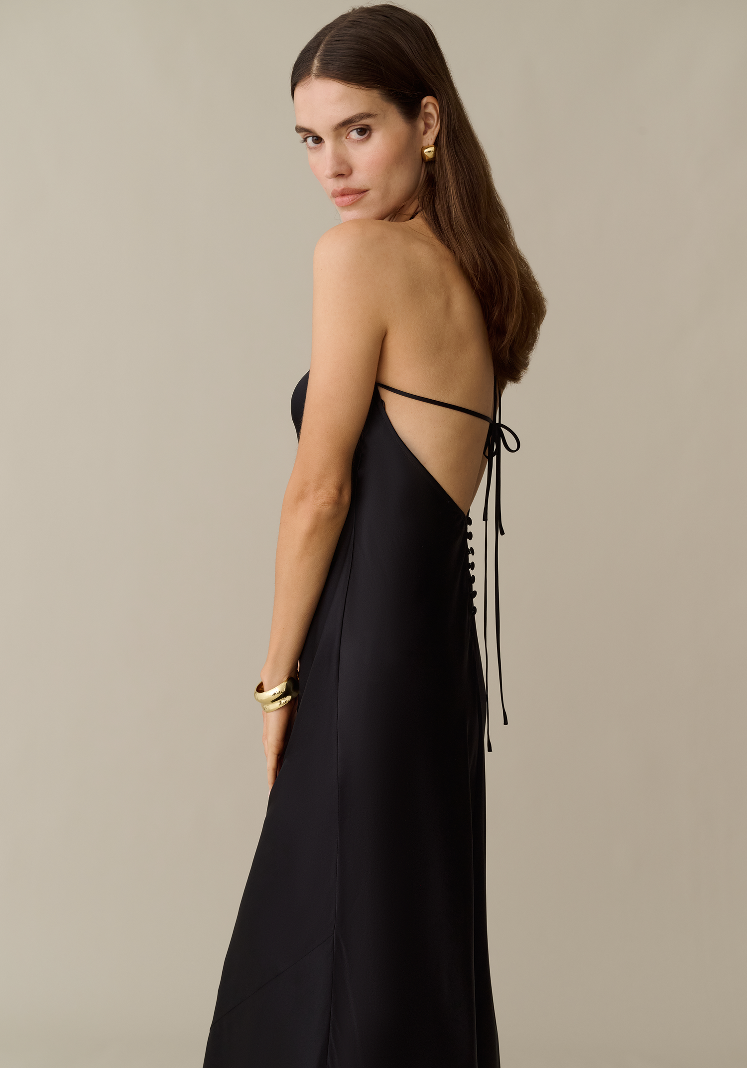 The Vita Silk Dress is made from sumptuous silk with thoughtful design details. The high neckline pairs beautifully with an open back, while adjustable ties and covered buttons provide a personalized, secure fit. A sophisticated choice for those seeking quality fabrics and timeless elegance.