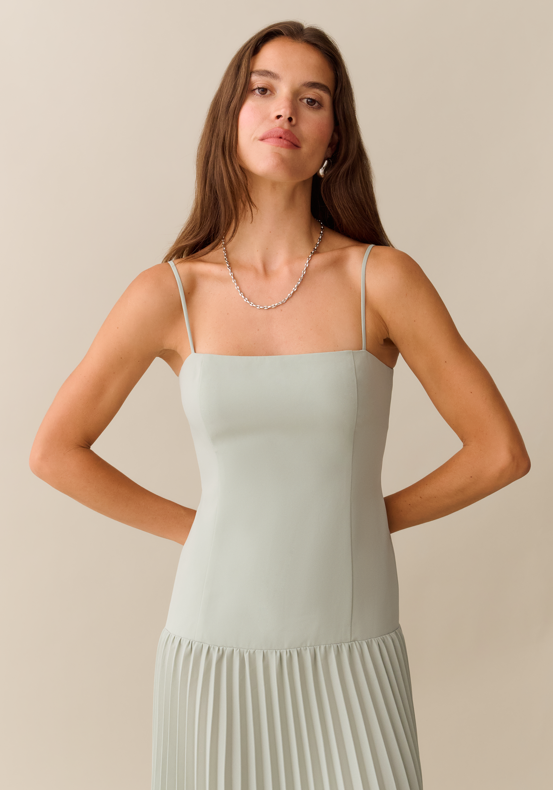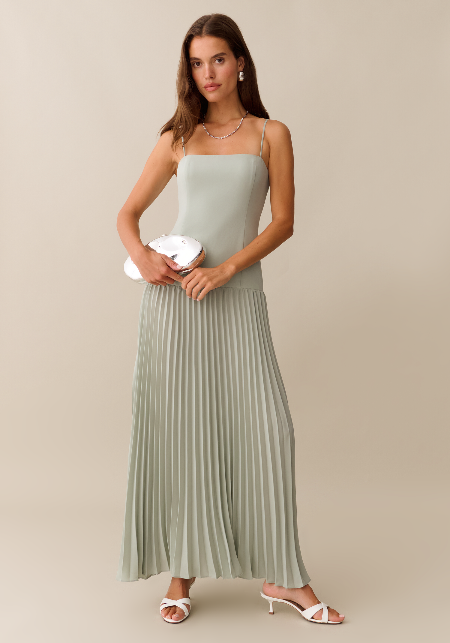 The Zephyra Dress features an elegant, simple silhouette with a flattering drop waist and delicate thin straps. Its pleated skirt adds graceful movement, creating a refined and timeless look perfect for sophisticated occasions.
