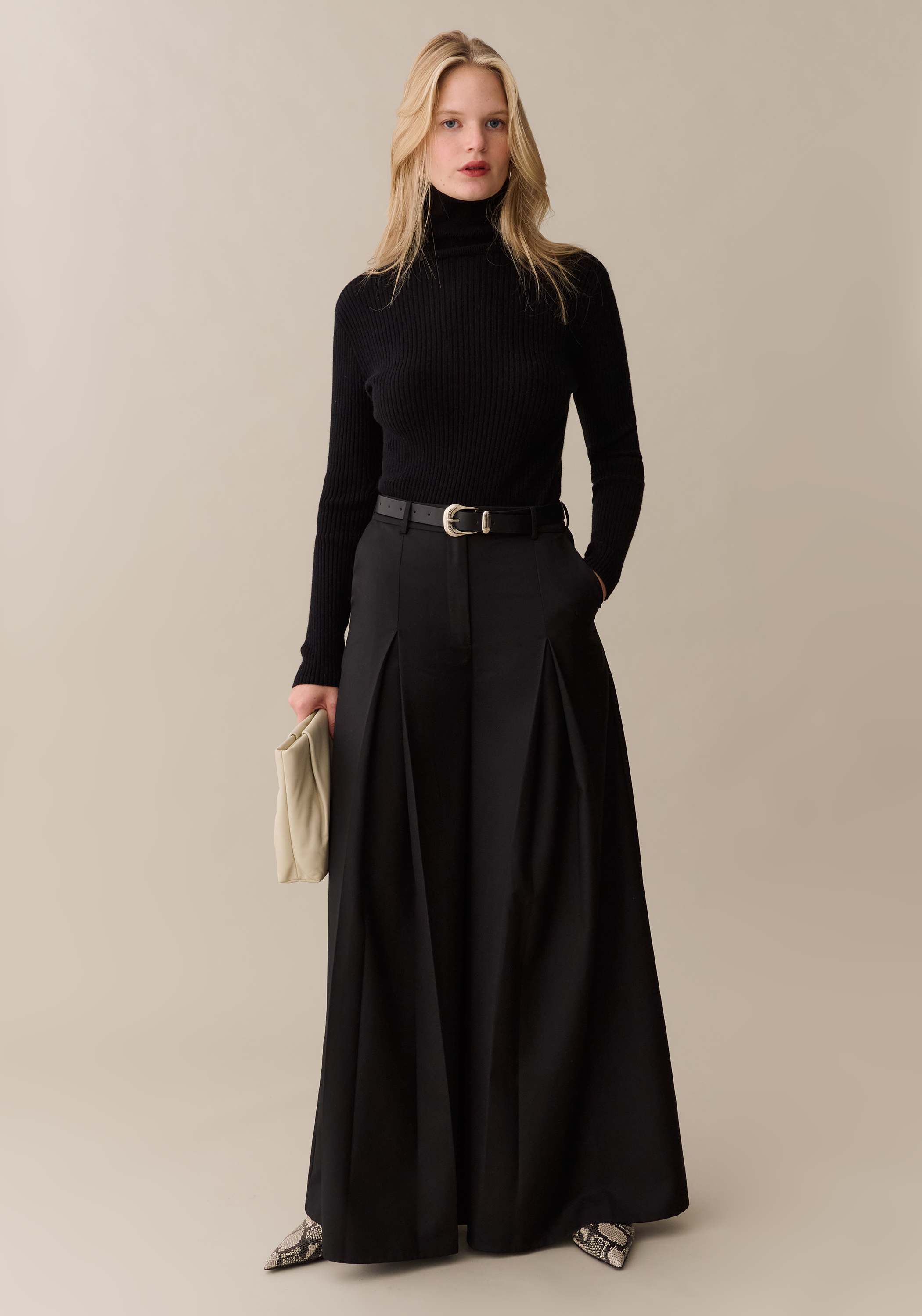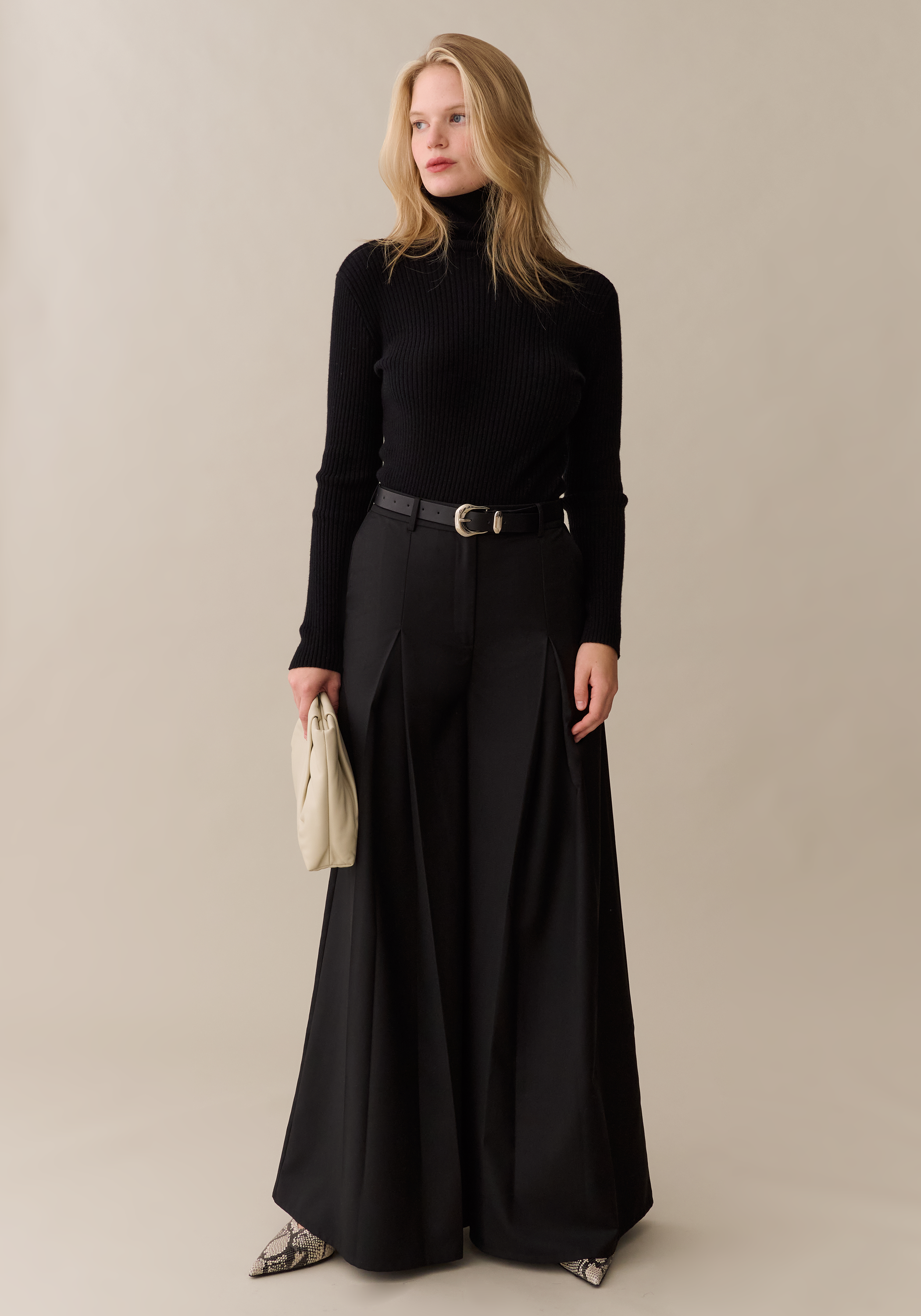 These wide-leg trousers feature sharp front pleats that create dramatic volume and fluid movement. A clean, high-rise waistband offers a flattering fit, while the long, sweeping length elongates the frame. Sleek and statement-making, they bring a modern edge to both refined and everyday looks.