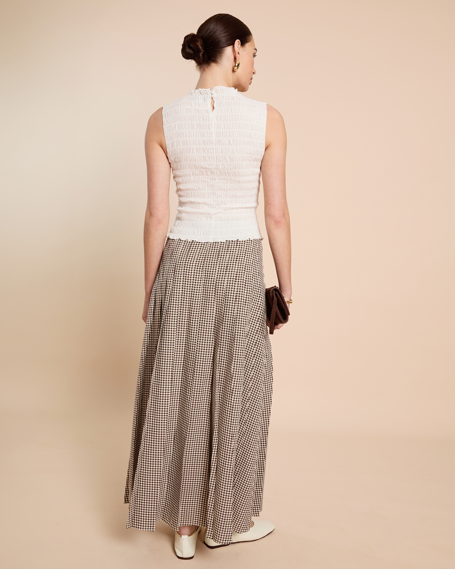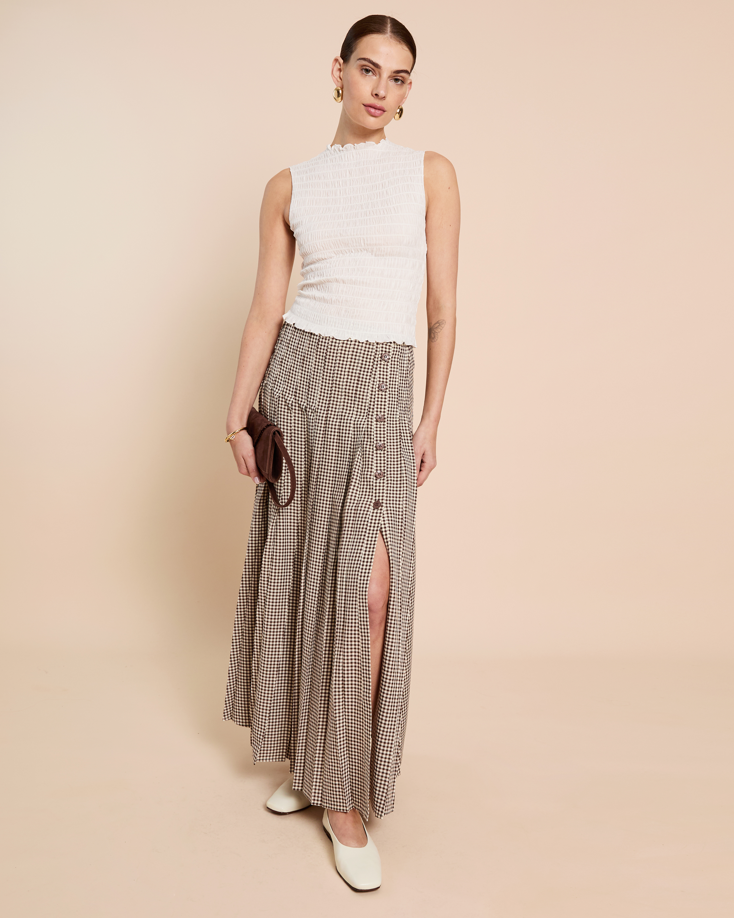 The Romina Skirt is a sweet pleated maxi skirt crafted from light, breezy fabric for all-day comfort. Its classic brown gingham pattern adds a timeless yet playful touch, while the side slit enhances movement and style. This skirt is finished with delicate flower-shaped buttons for a final unique touch, making it sure to stand out in any wardrobe.