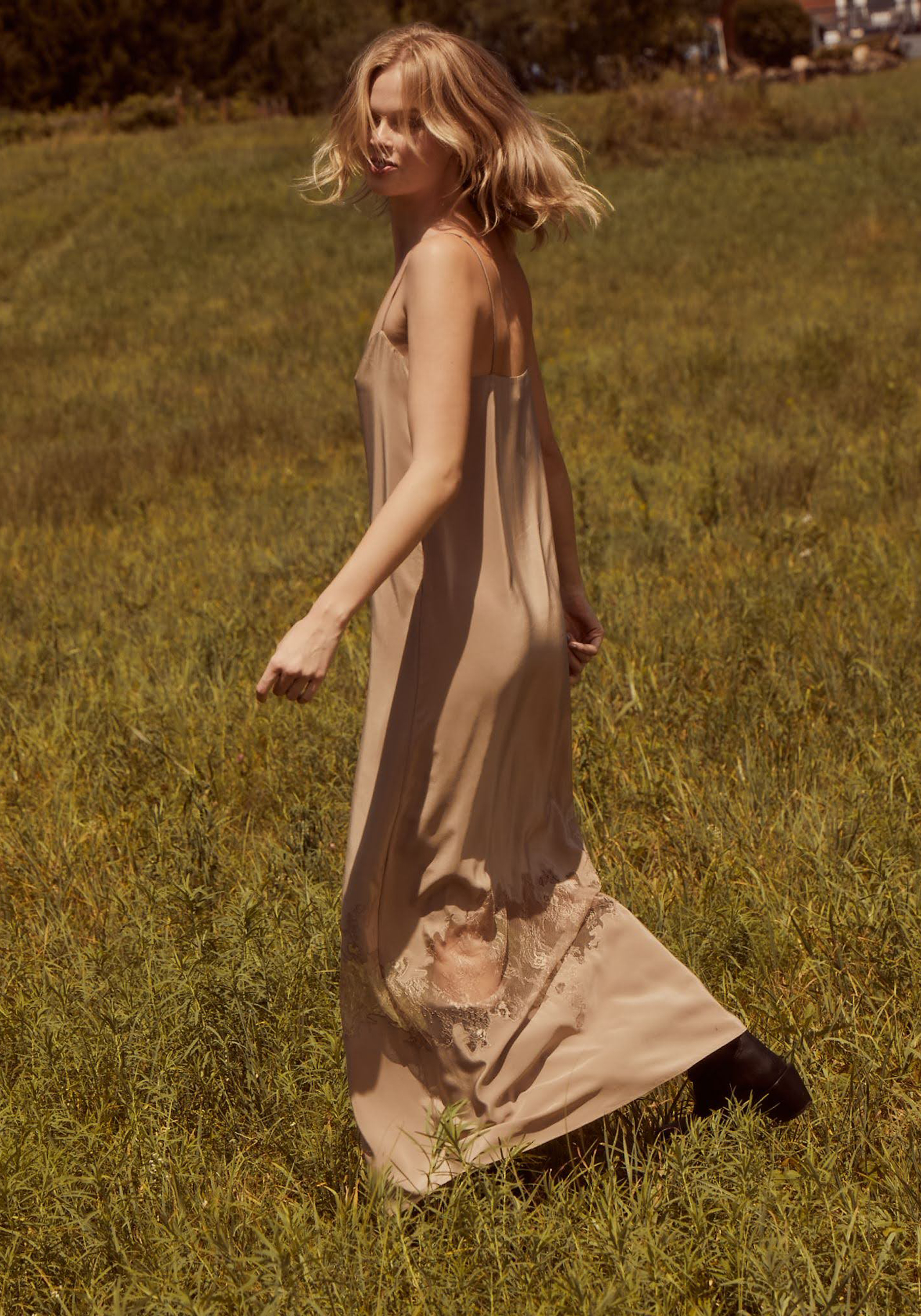The Maeve Silk Dress is a maxi-length cami dress crafted with delicate lace sheer paneling that adds a subtle romantic touch. Its easy neutral hue makes it a versatile piece, effortlessly transitioning from daytime elegance to evening sophistication.