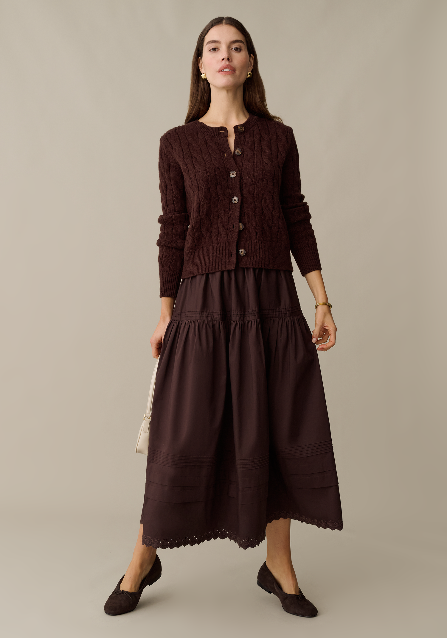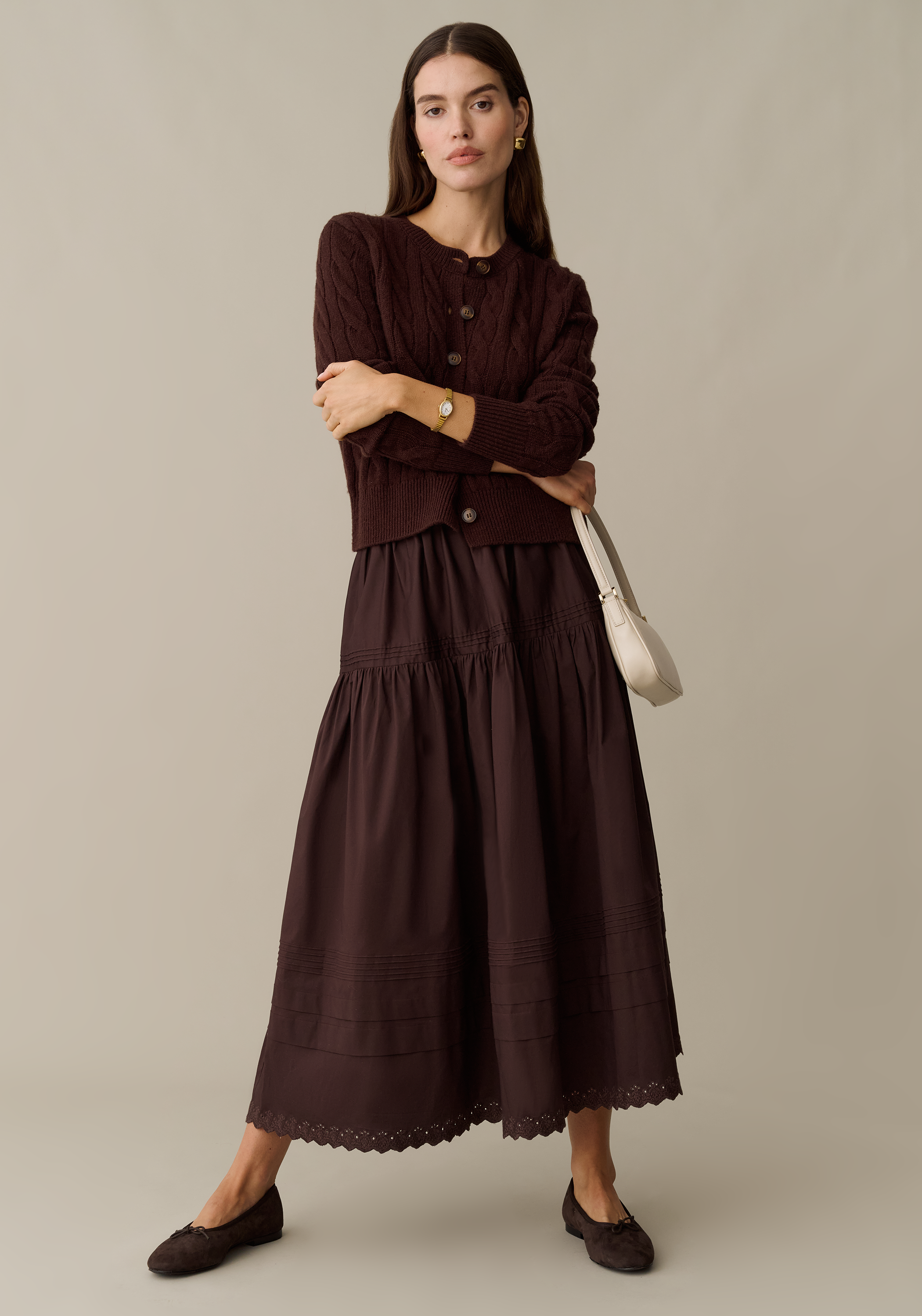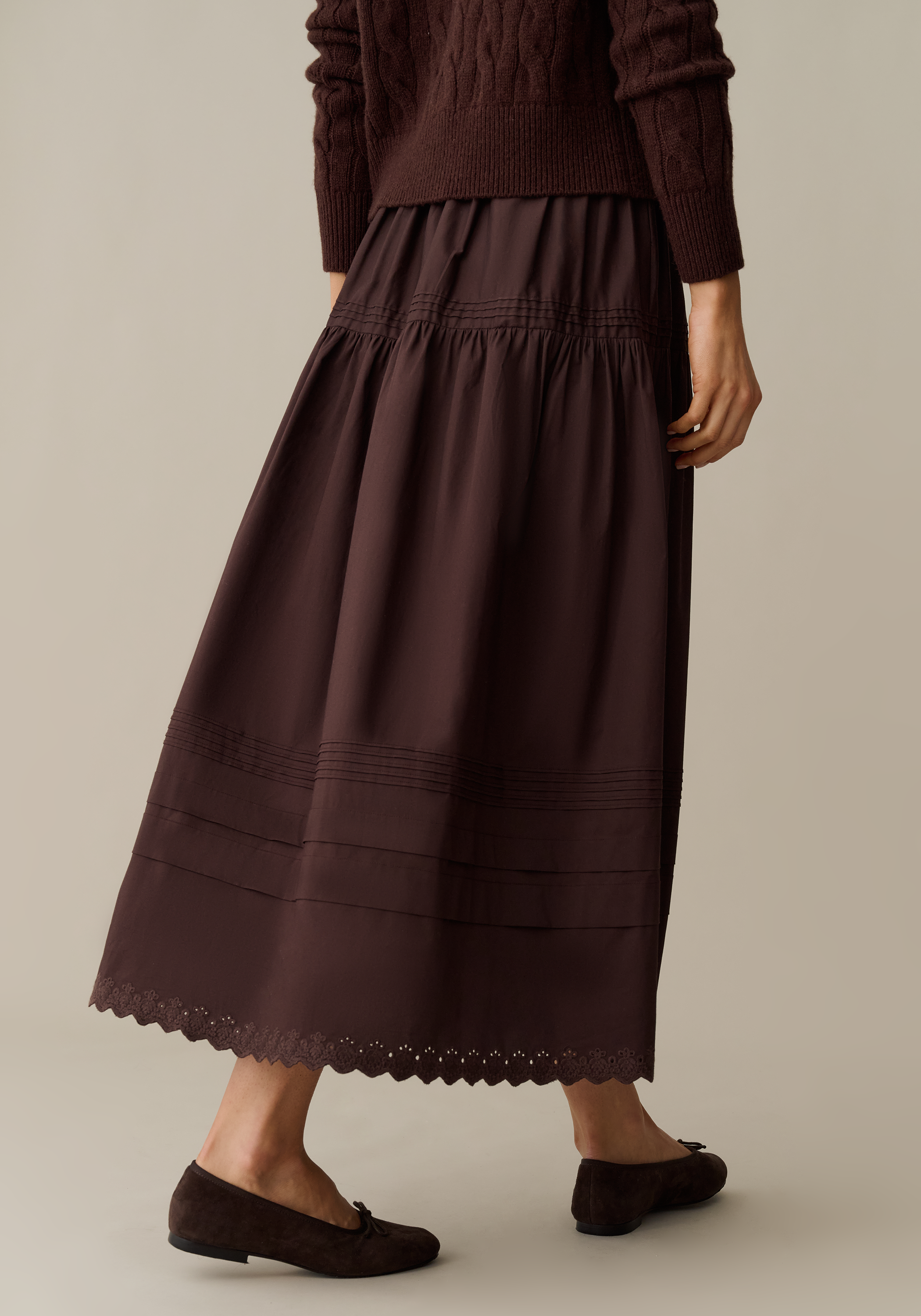 Made of floaty cotton, this gorgeous maxi skirt offers natural volume and dainty detailing with lace and pleated trim. Feel effortlessly elegant and feminine with this versatile must-have addition to your wardrobe.