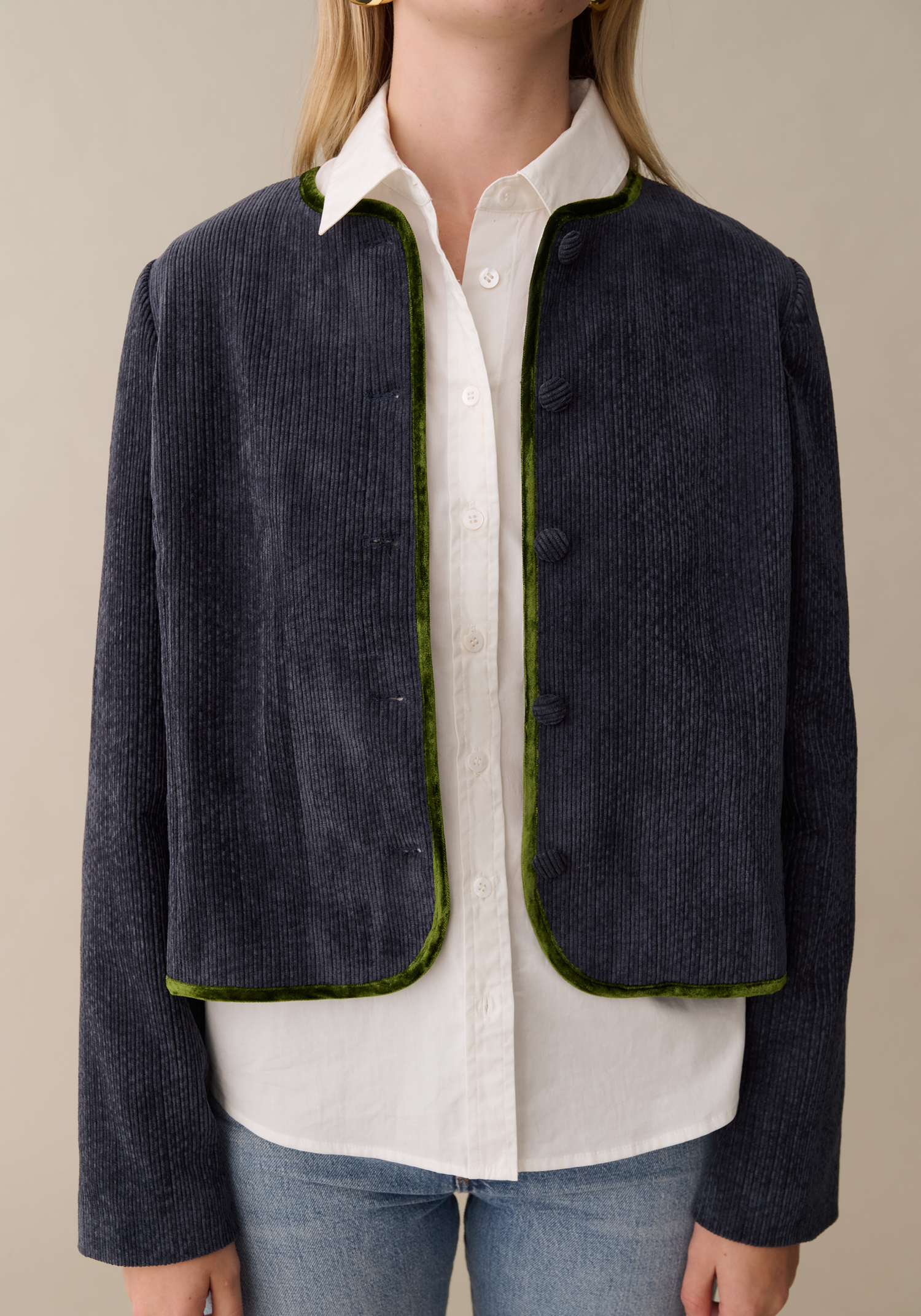 This cropped jacket blends classic corduroy texture with refined details, featuring a contrast velvet trim that adds depth and polish. The clean, collarless neckline and fabric-covered buttons keep the silhouette minimal and modern. A versatile piece that instantly elevates everyday denim and tailored staples alike.