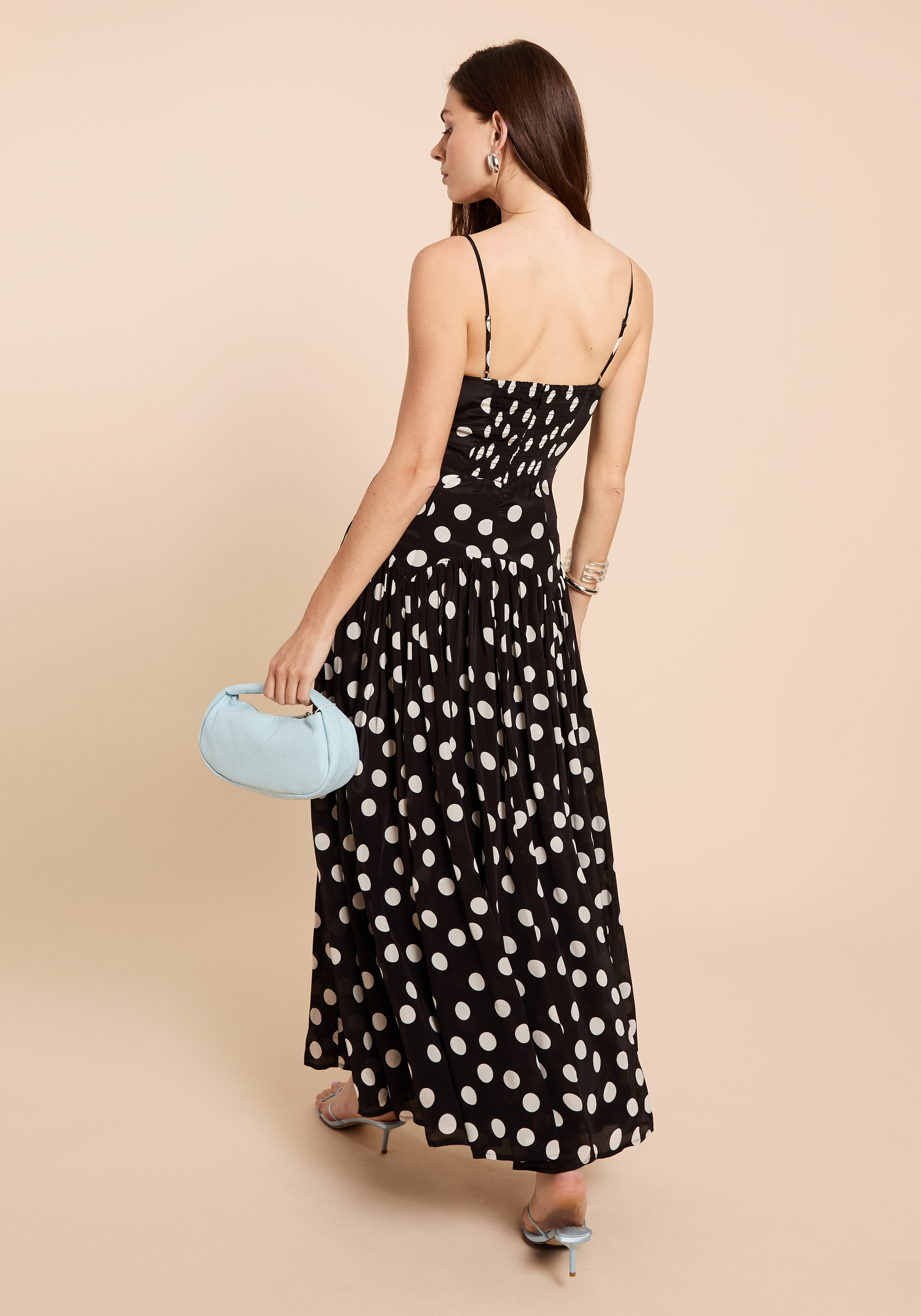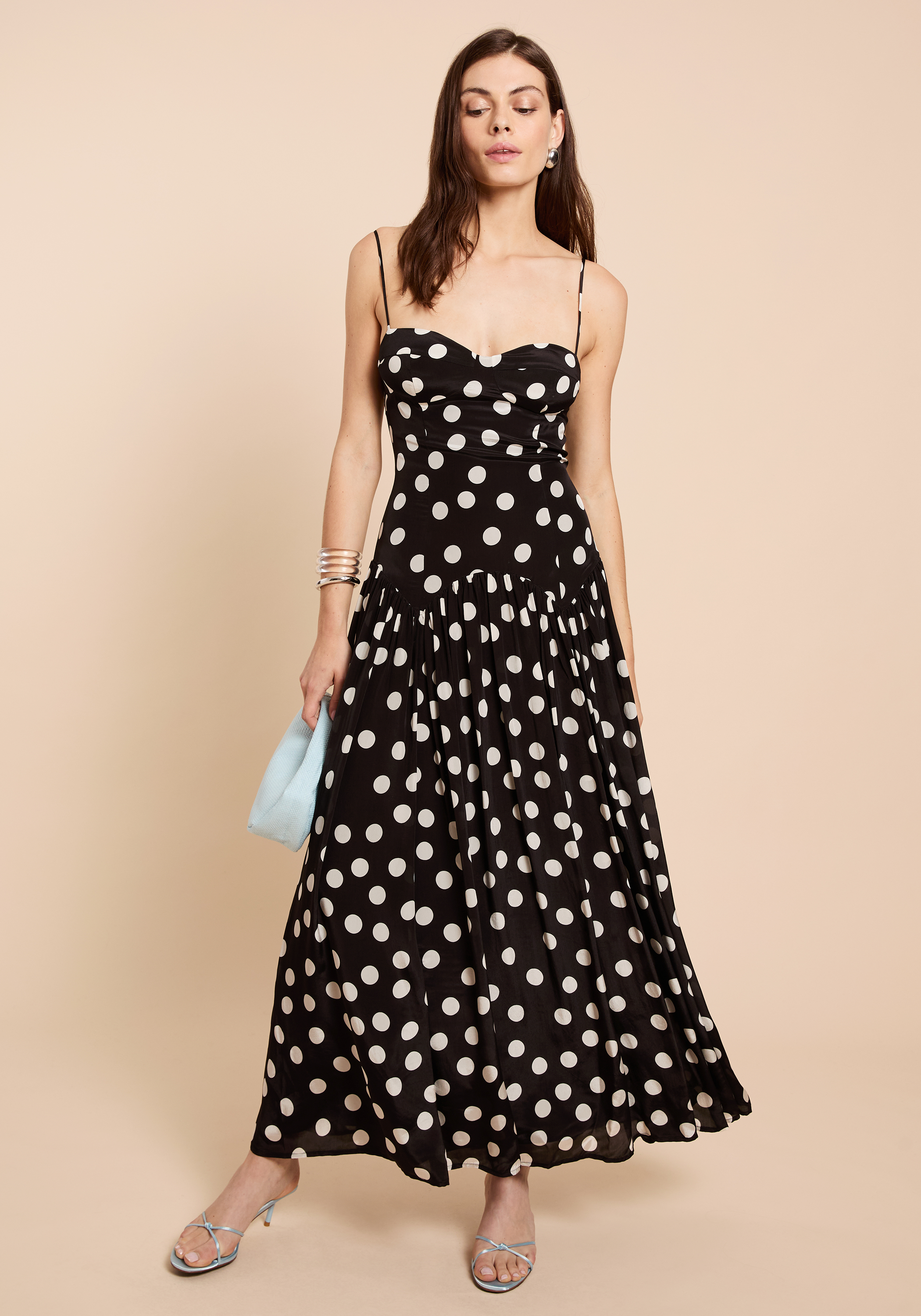 The Auden Dress showcases a fitted bodice paired with a drop waist that gracefully leads into a flowing skirt. Its lively polka-dotted print brings a fun and flirty vibe, perfectly balancing classic elegance with playful charm.