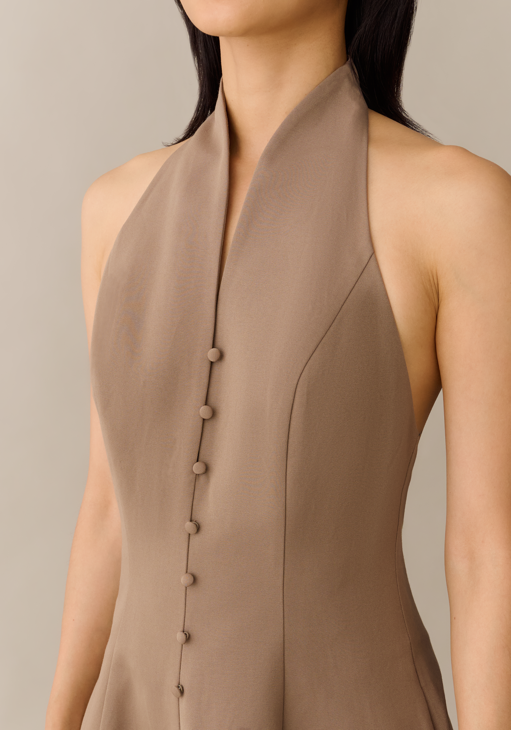 The Jora Dress's structured design showcases a low back and a sleek, fitted bodice. Detailed with covered buttons and rendered in a soft taupe hue, this dress exudes subtle sophistication and refined elegance.