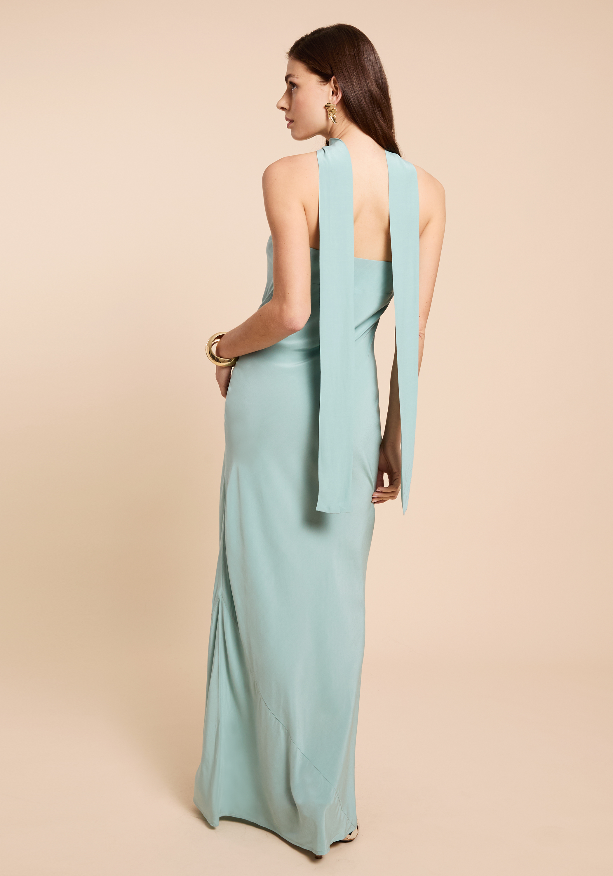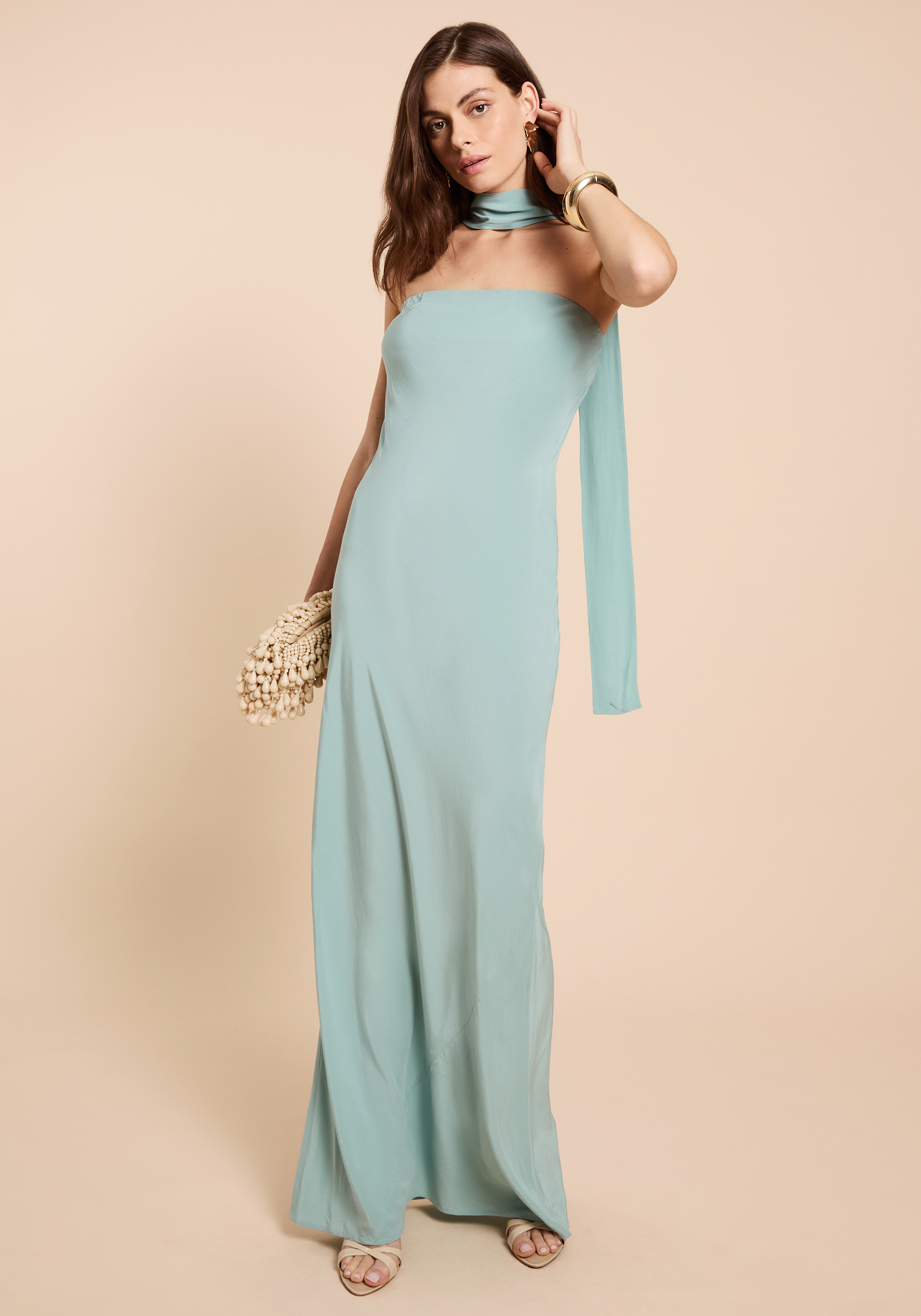 The Marice Dress features a simple, sleek strapless silhouette complemented by a matching scarf, creating a polished and sophisticated look.