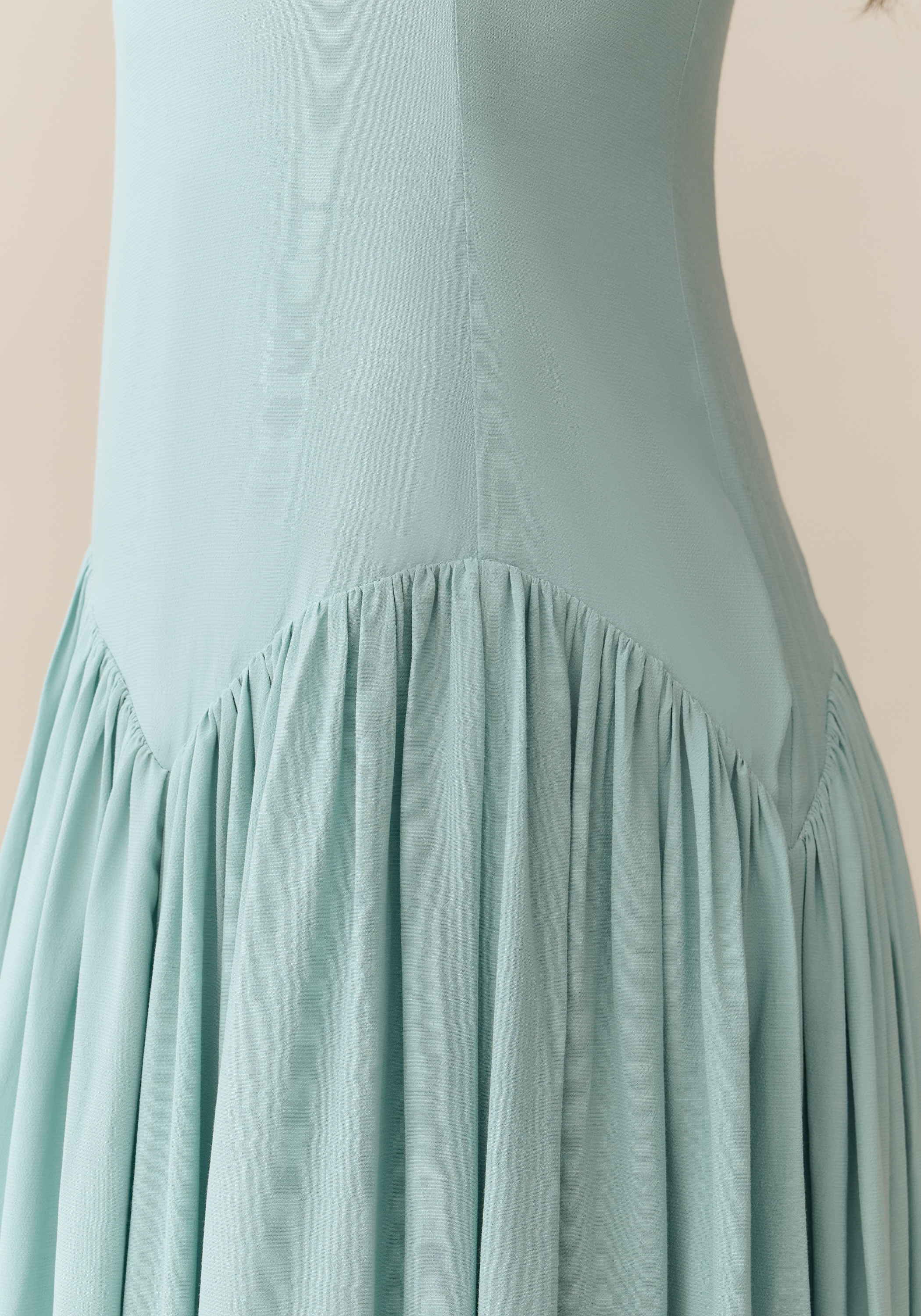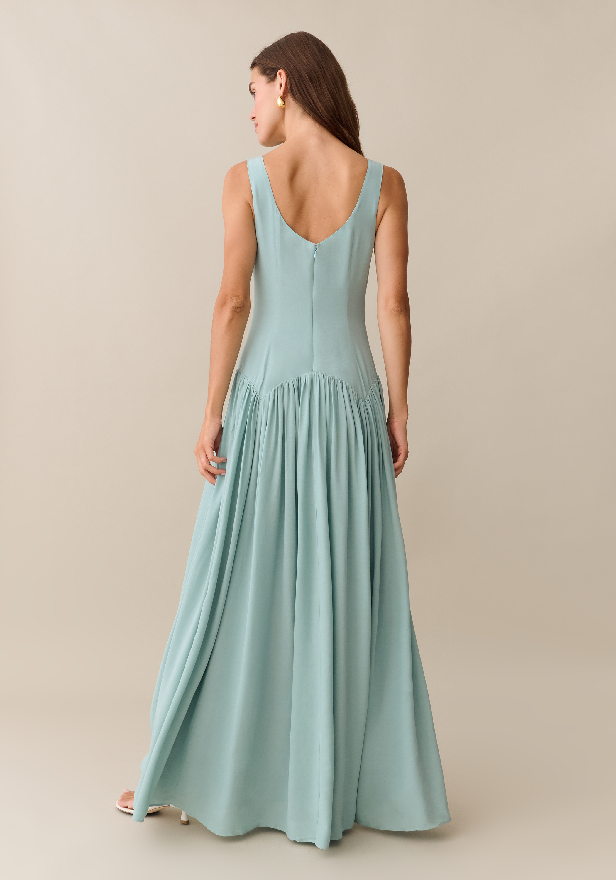 The Odessa Dress presents a sleek and sophisticated profile with its drop waist silhouette, finished with a light and airy skirt. Featuring an elegant high neckline, this expertly crafted dress offers a refined and timeless look suitable for formal occasions and stylish events.