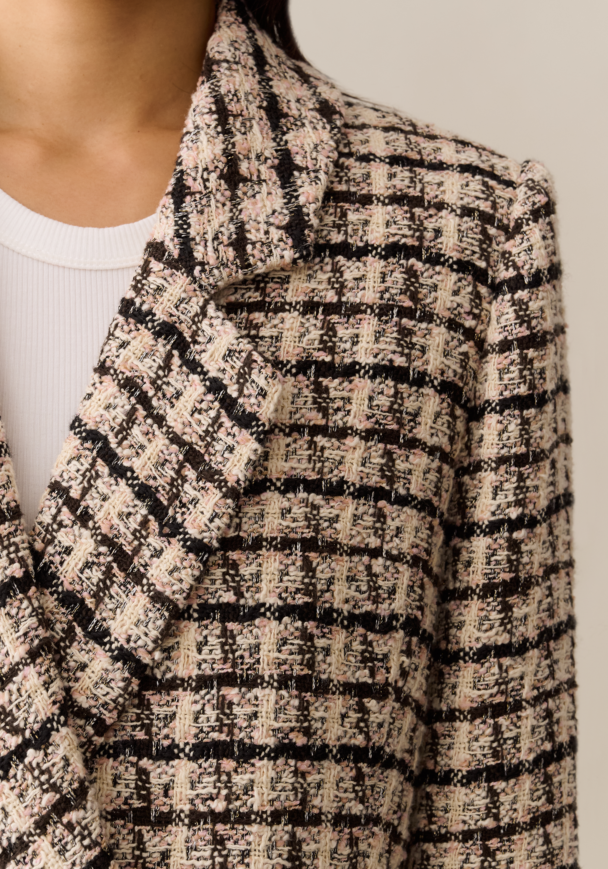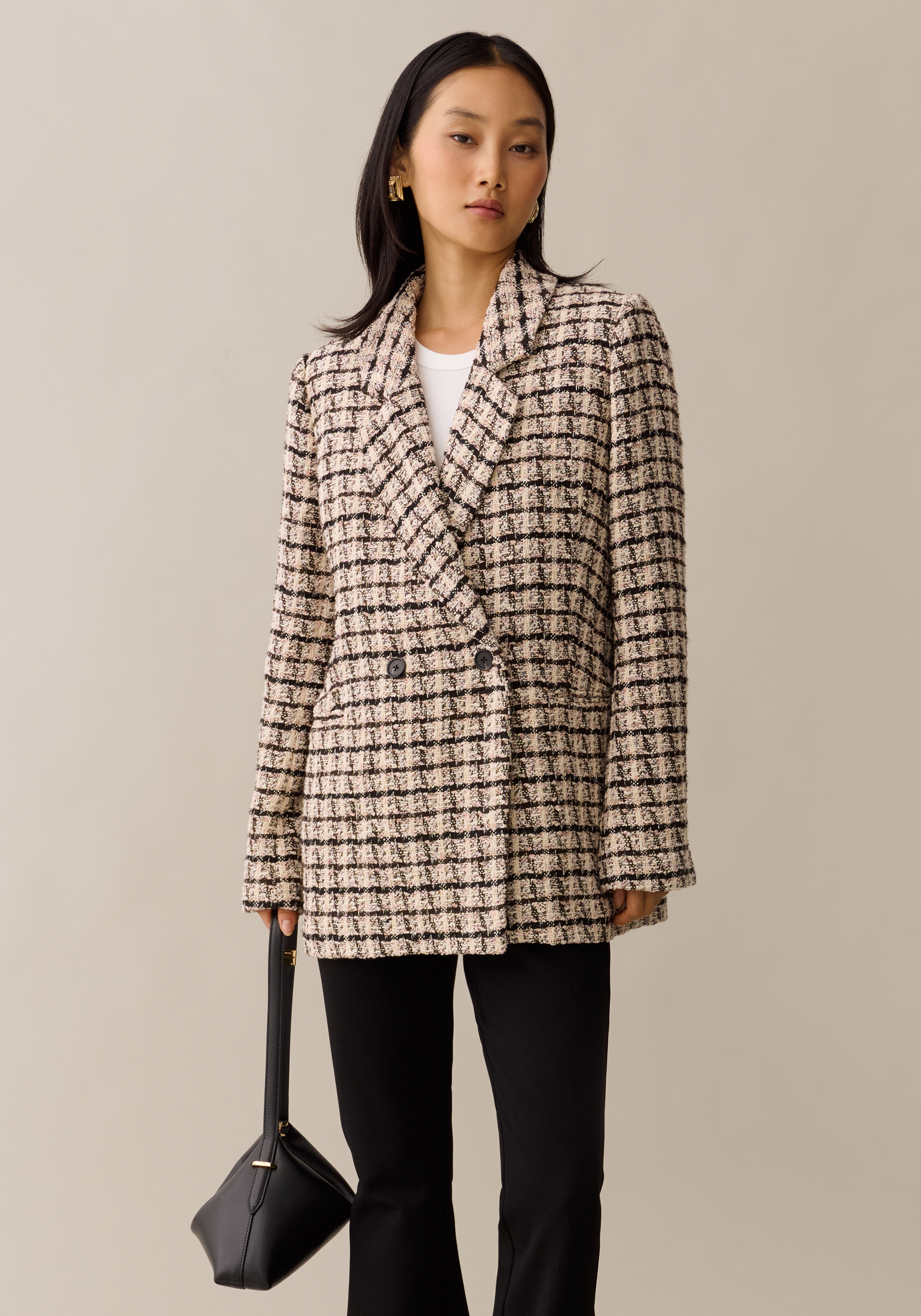The Grayson Blazer is done in tweed with a delicate hint of soft pink, bringing a fresh twist to a classic texture. Its double-breasted front and oversized fit deliver a structured yet relaxed feel, achieving a polished and effortlessly cool aesthetic. Ideal for those seeking a modern statement piece that combines timeless elegance with contemporary ease.