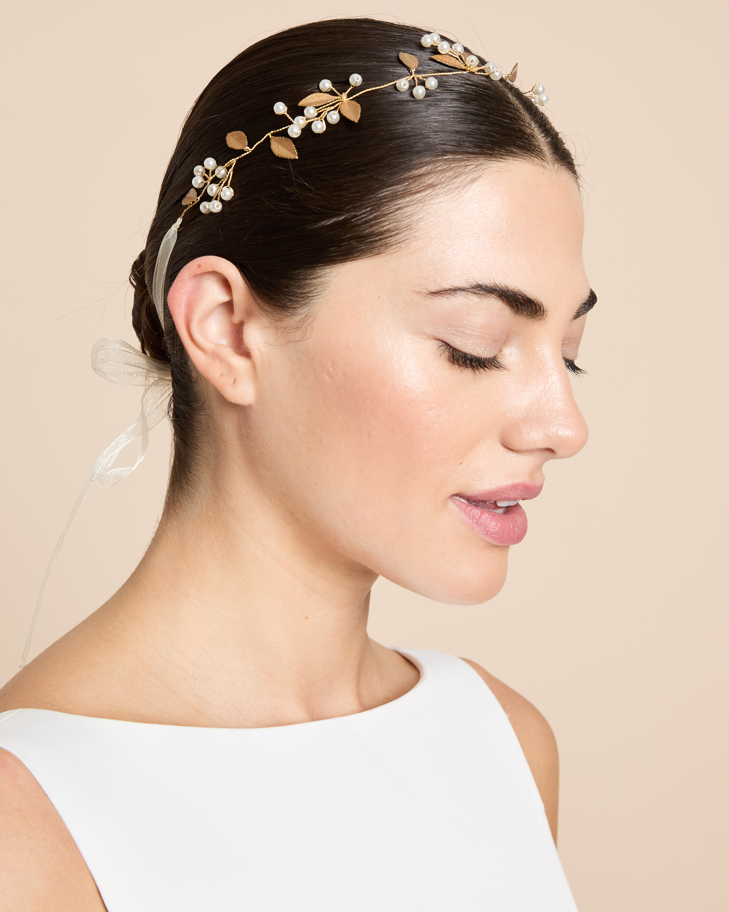 Feel like a fairy with this headpiece. Golden leaves and pearls create a bejeweled garland for the perfect adjustable and romantic look.