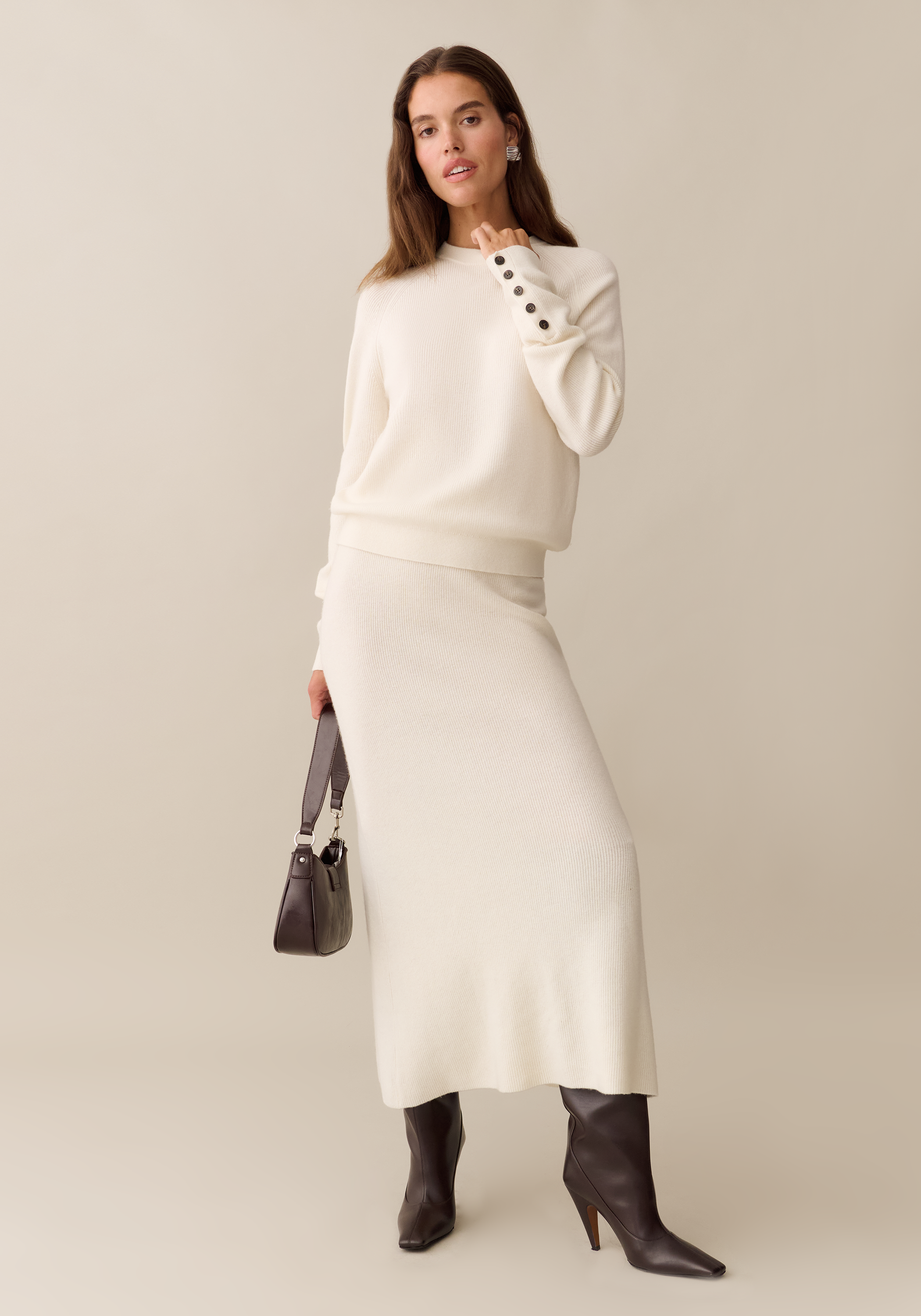 The Arielle Wool Set is made from a soft, stretchy ribbed knit wool in an elegant cream shade, combining comfort with sophistication. This chic set is designed to feel effortless while offering an elevated look, accentuated by cool button details. Ideal for those who appreciate refined style with relaxed ease.