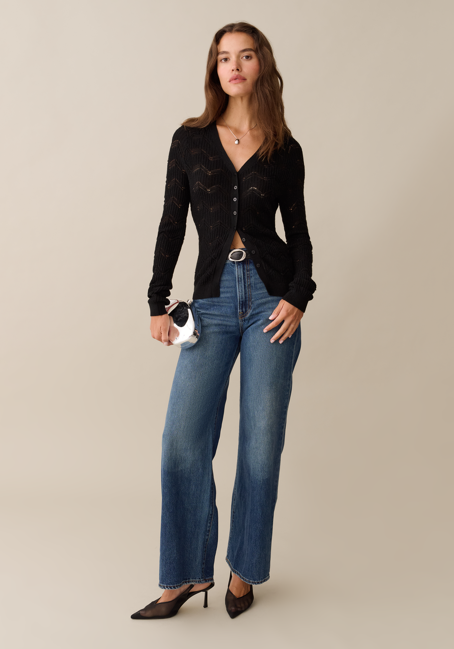 The Silva Sweater features a delicate pointelle knit crafted from a soft wool blend, offering gentle warmth and breathable comfort. Its stretchy fabric ensures a flattering, fitted silhouette that moves with you. Designed with a versatile V-neckline, it can be worn layered or on its own, making it an essential piece for both cozy and polished looks.