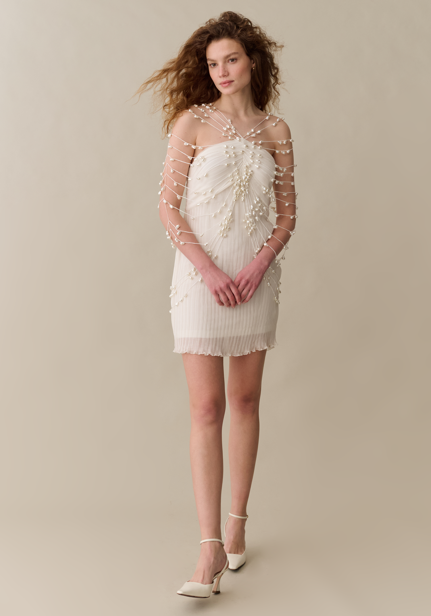 Adorned with cascading strands of pearls, this mini dress brings ethereal elegance to a modern silhouette. The pleated fabric adds soft texture beneath the intricate embellishment, while the strapless neckline keeps the look balanced and refined. A true statement piece, designed to captivate from every angle.
