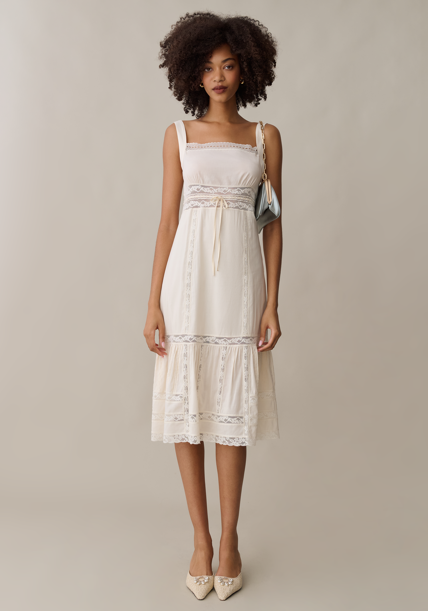 This midi dress features a structured square neckline and a cinched empire waist that flows into a graceful, knee-grazing silhouette. Constructed with panelling and sheer lace trim, while the tiered ruffle hem brings a soft and dreamy energy to this effortlessly charming look.