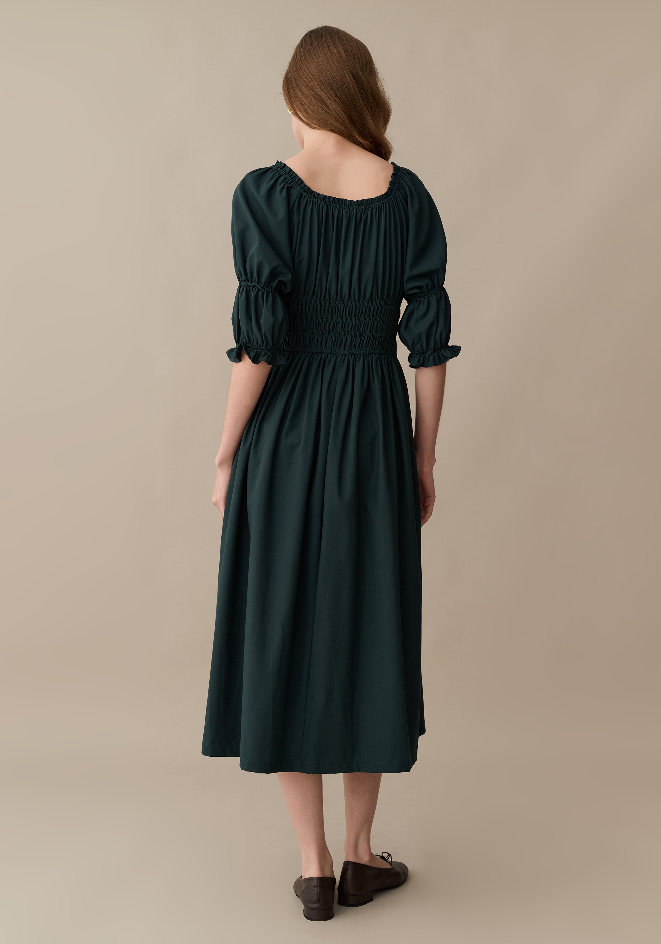 The Marguerite Cotton Dress features a flattering square neckline paired with elegant puff sleeves, creating a timeless silhouette. Its ruched bodice enhances the fit, while a charming tie detail adds a delicate touch.