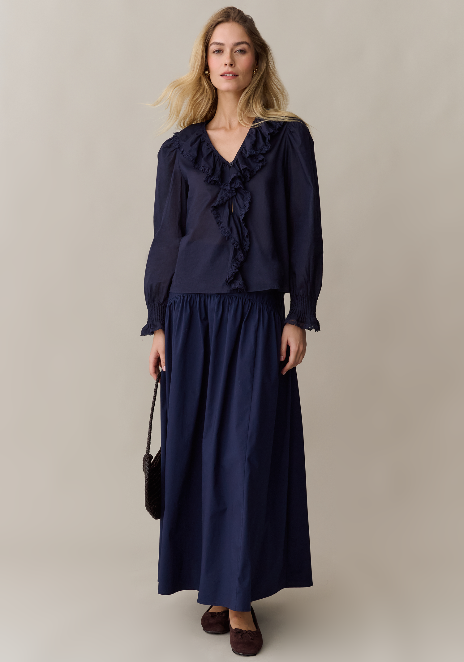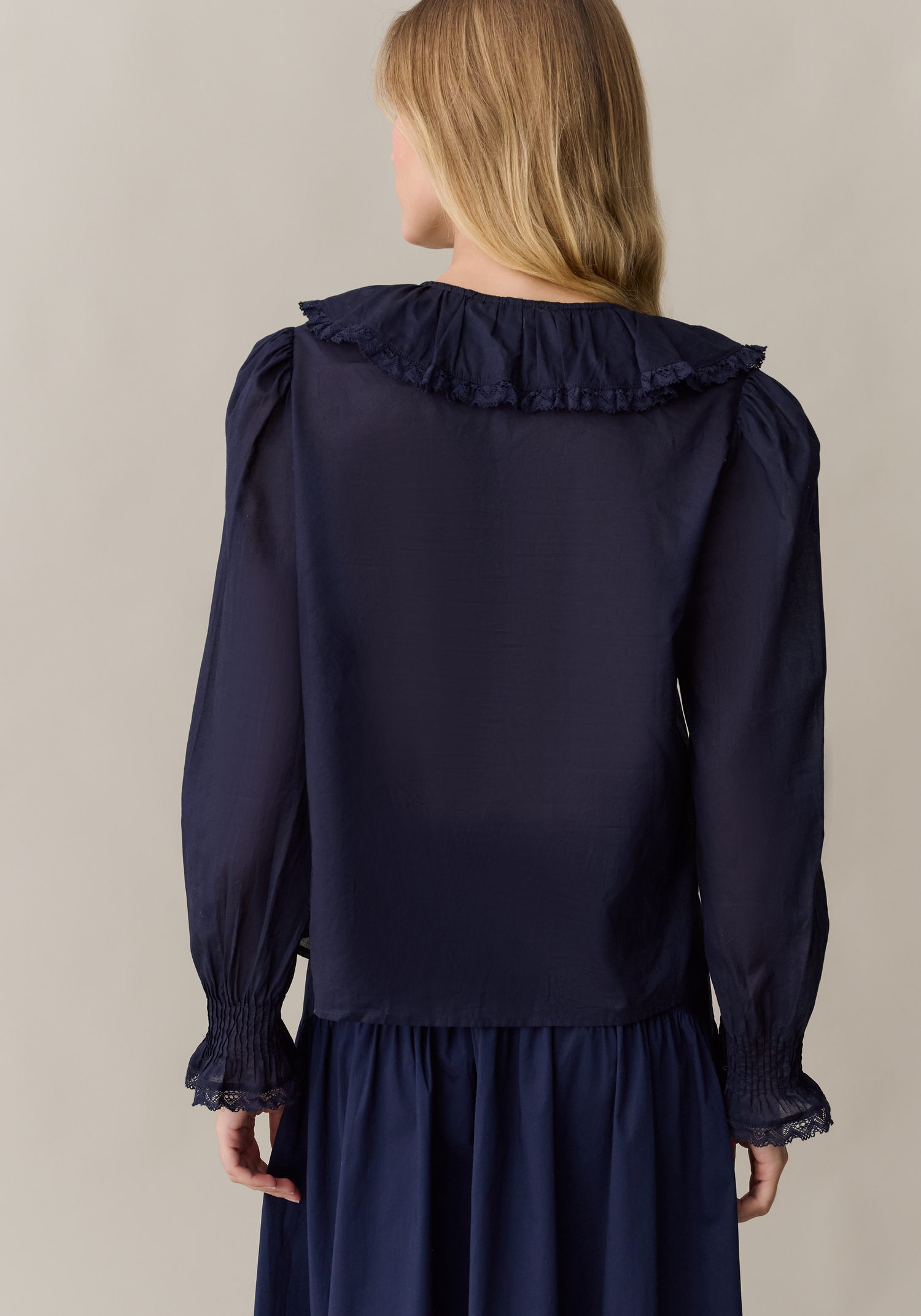 The Leda Top features a button-up front and delicate ruffles, made from luxurious textured cotton. Pleated details on the cuffs add a touch of elegance to this elevated piece.