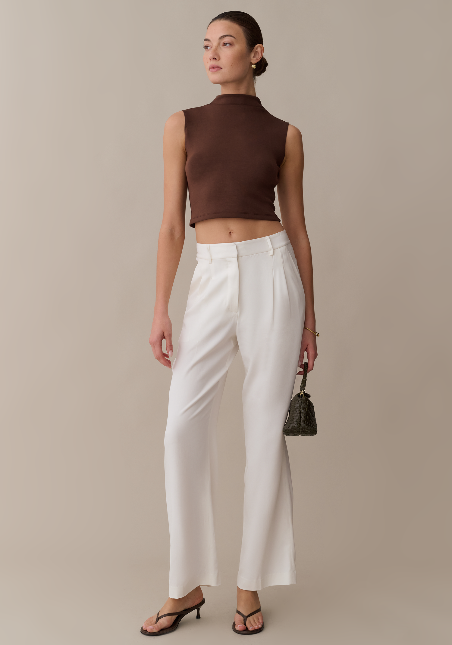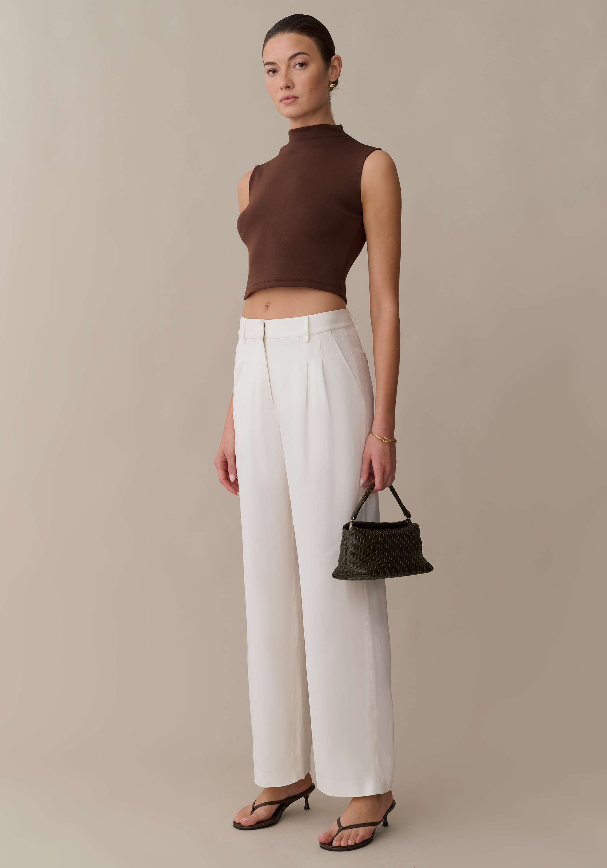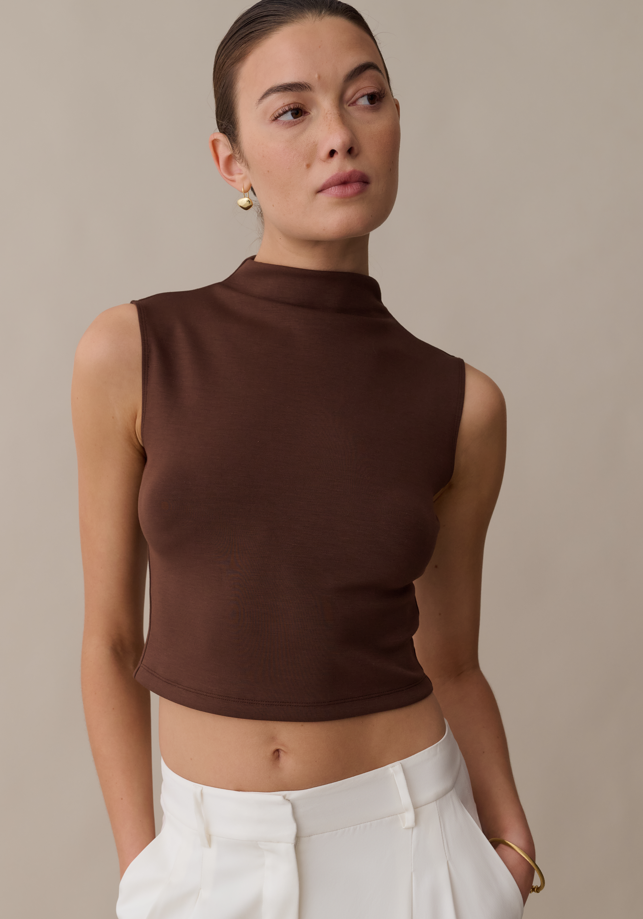 Basic better with this cool, mock neck style. Done in a super soft and stretchy material with a rich brown hue, this piece is our new go-to. The cropped silhouette and sleeveless design make it easy to take from day to evening.