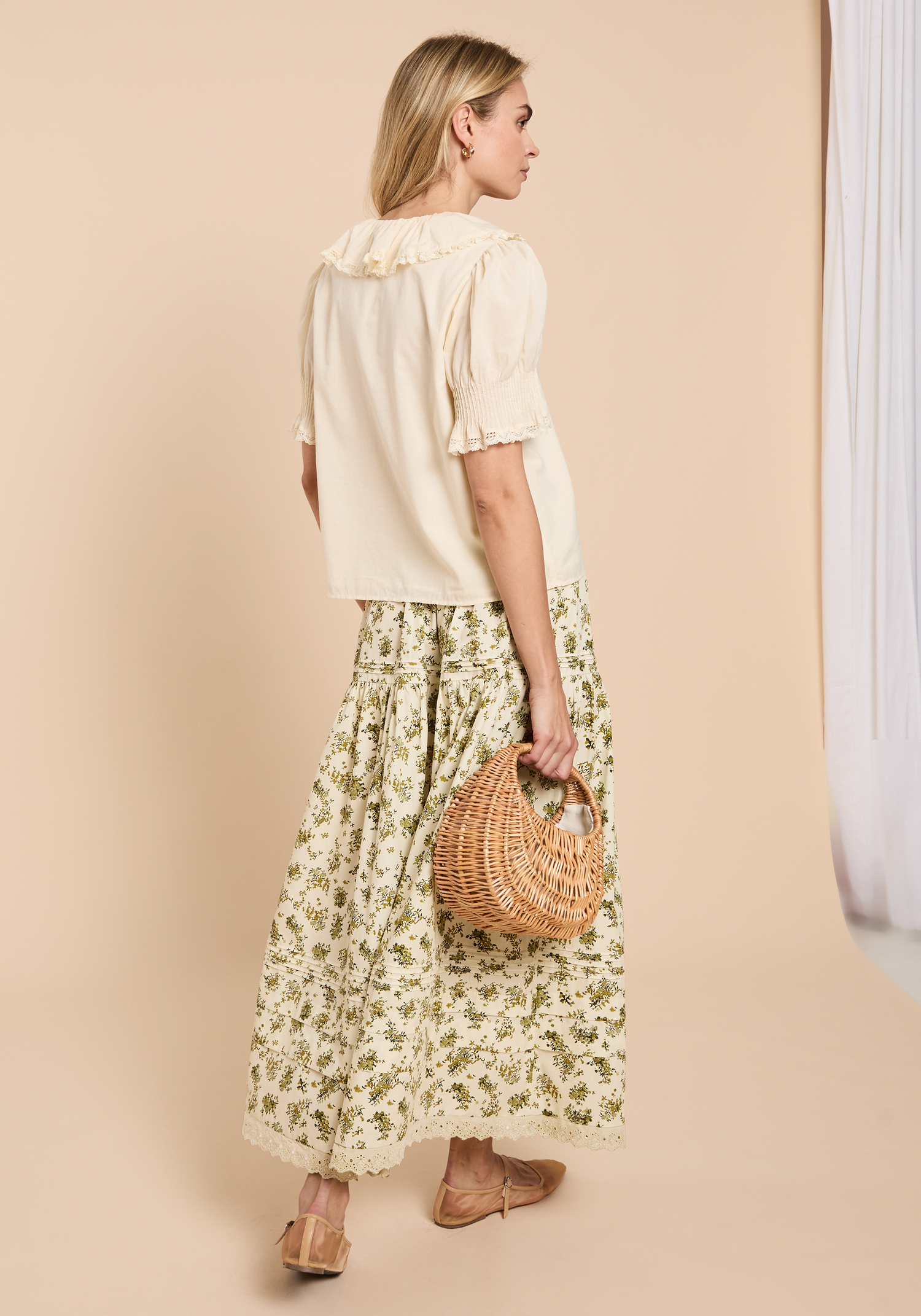Made of floaty cotton, this gorgeous maxi skirt offers natural volume and dainty detailing with lace and pleated trim. Feel effortlessly elegant and feminine with this versatile must-have addition to your wardrobe.