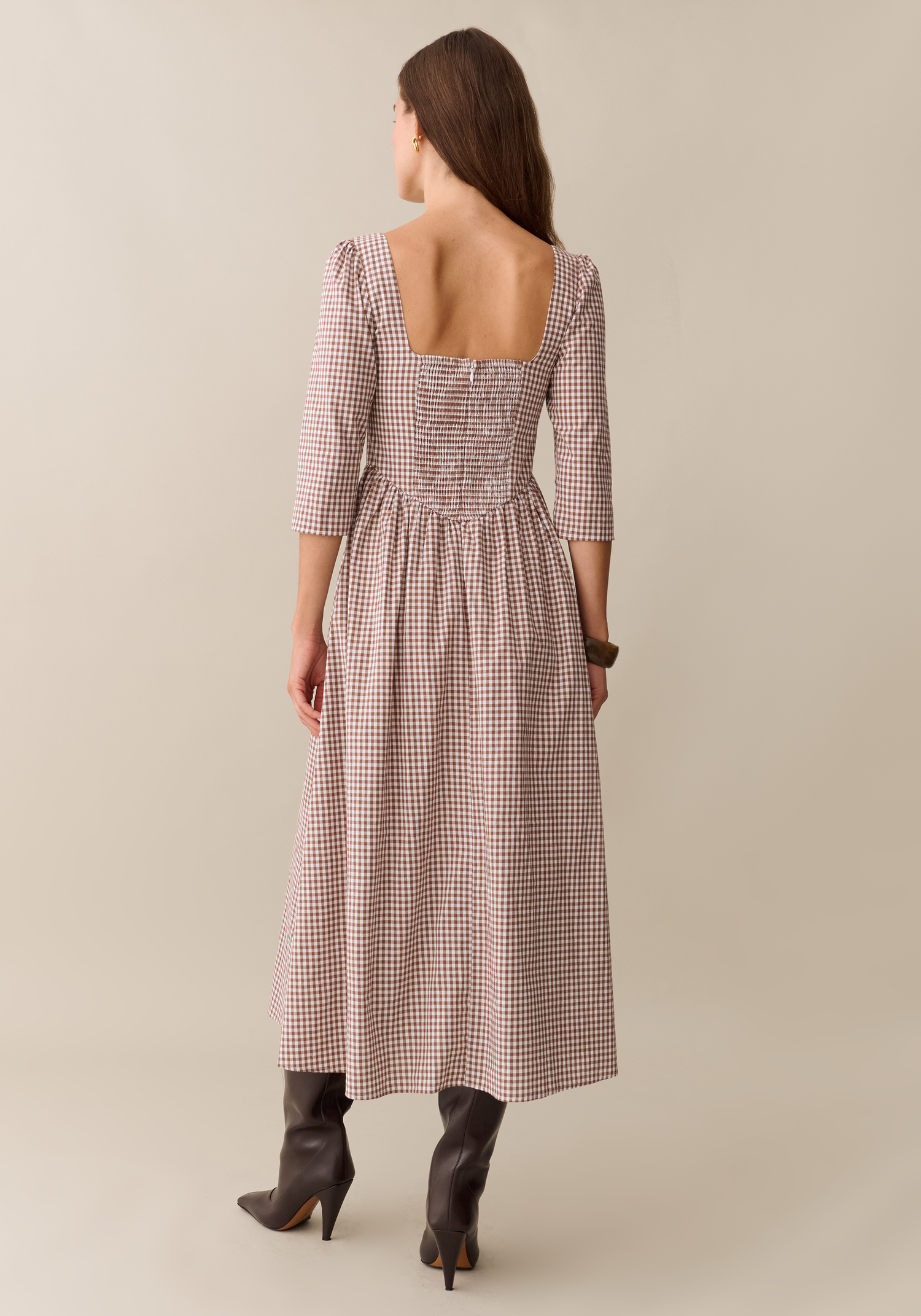 The Lucette Cotton Dress features a charming gingham pattern with 3/4 length sleeves and a fitted bodice that flatters your silhouette. The gathered bust is enhanced by a delicate tie detail, adding a subtle touch of femininity. Designed for everyday wear, this dress combines comfort with timeless style, making it a versatile addition to your wardrobe.