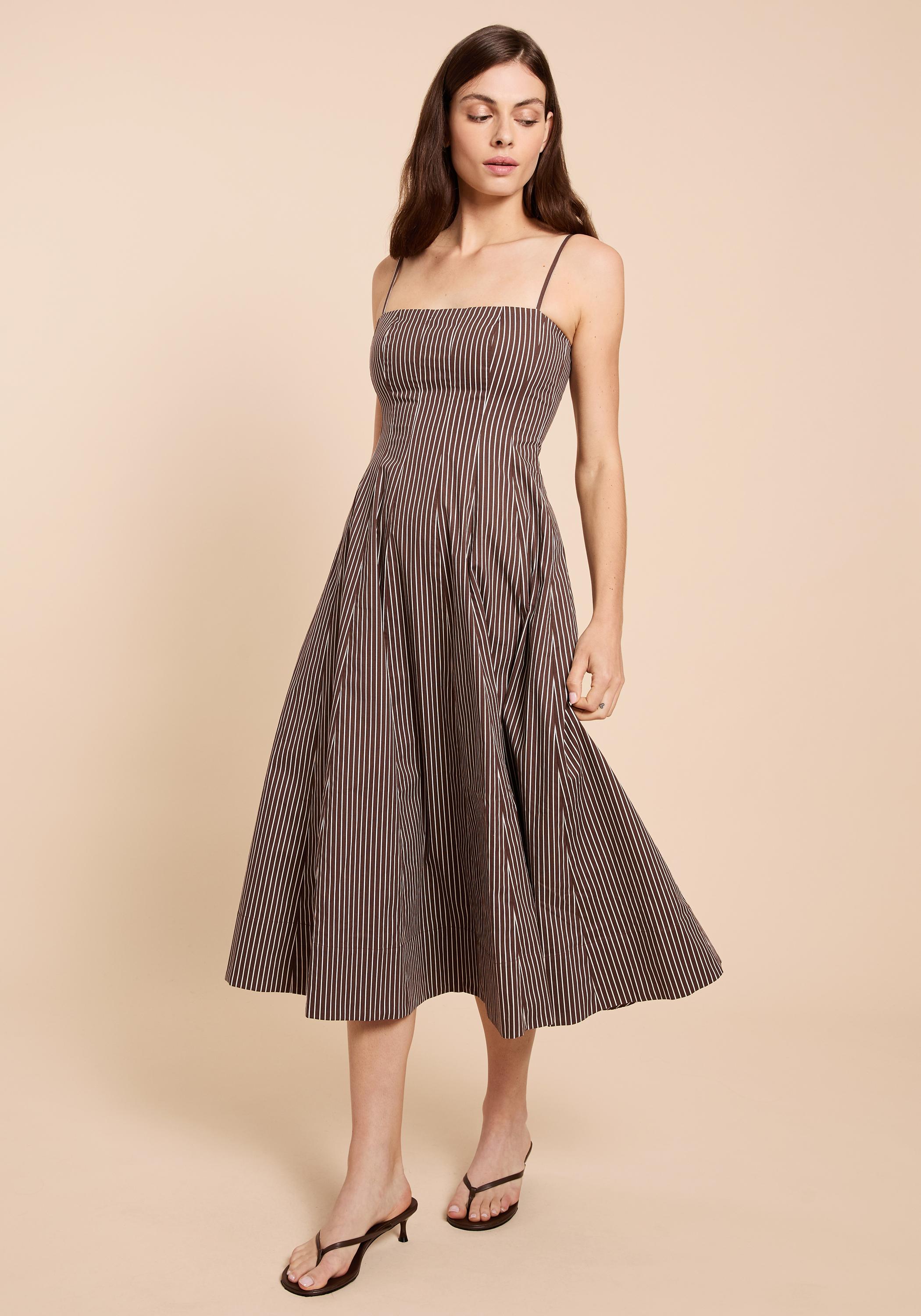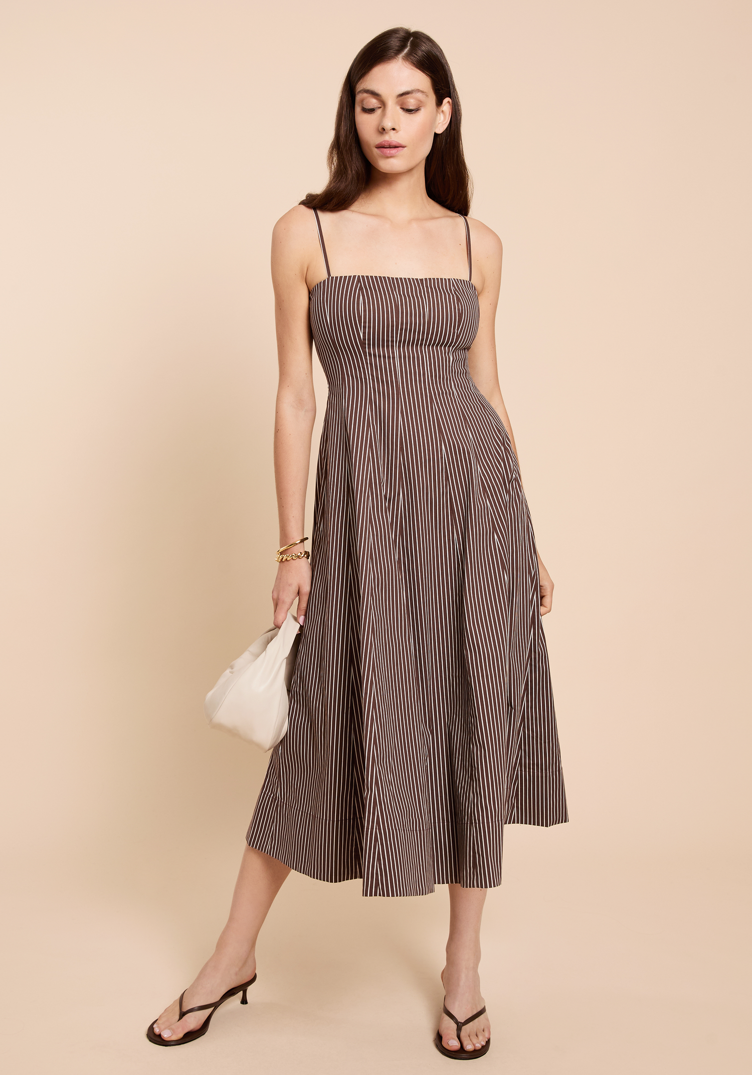 The Melanie Dress features expertly crafted paneling that enhances its simple A-line silhouette, offering a flattering and timeless shape. Its straight neckline adds a clean, modern touch, while the brown striped fabric provides an easy cool feel.