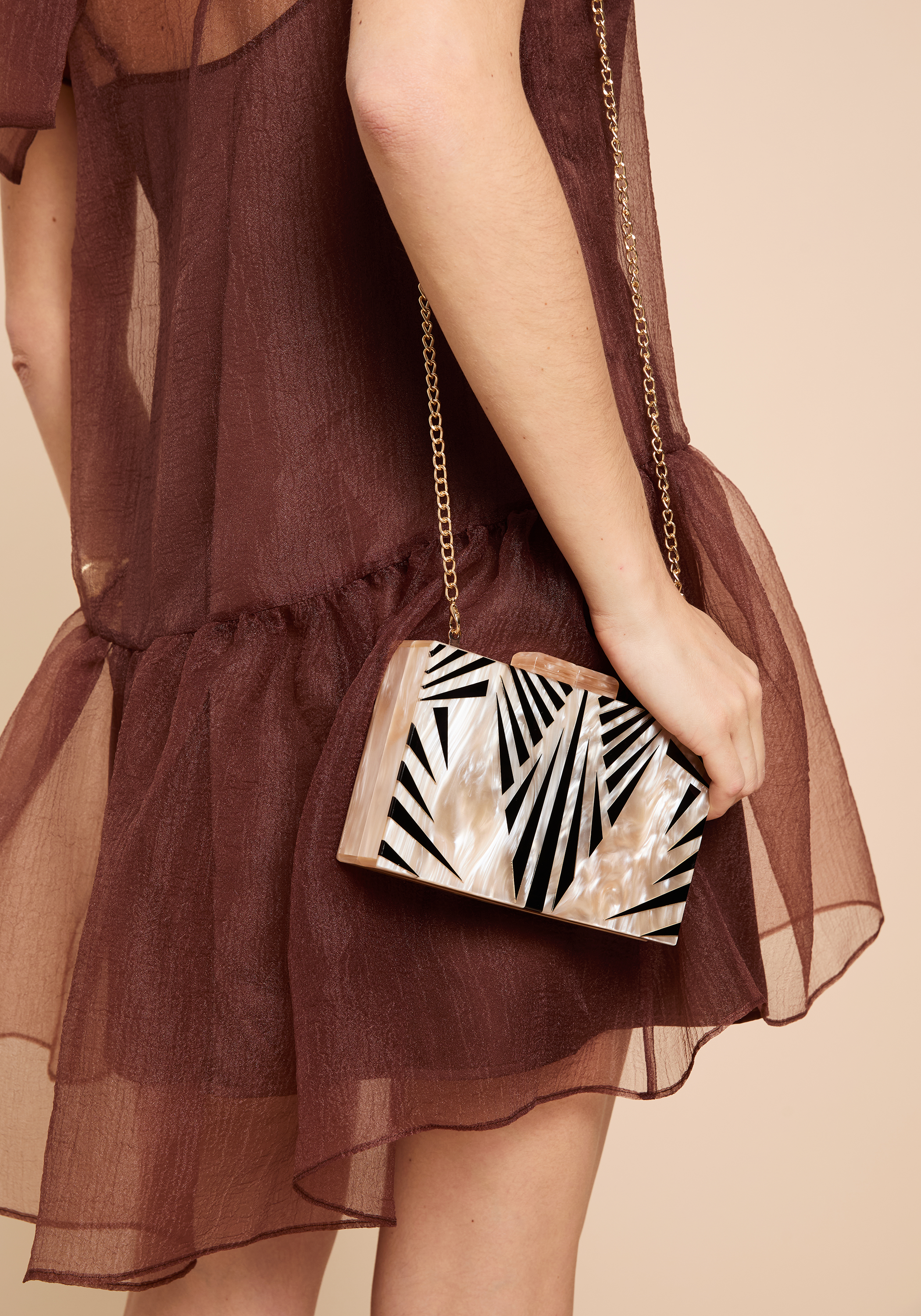 The Cely Clutch is made from enamel in a warm pearlescent hue, elegantly complemented by striking black Art Deco details. This refined accessory combines timeless design with a modern edge, making it an ideal choice for elevating evening ensembles.