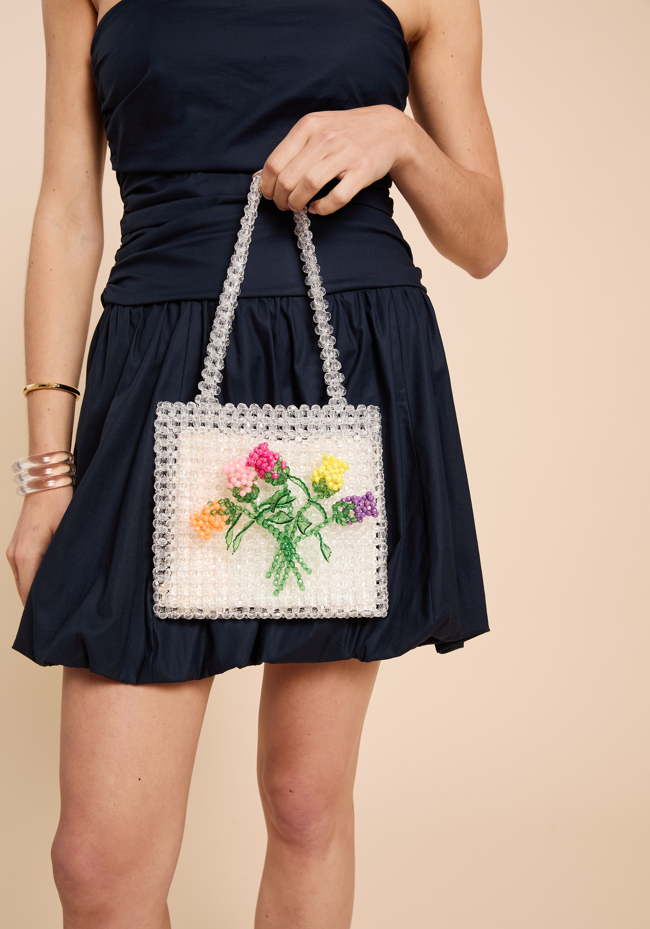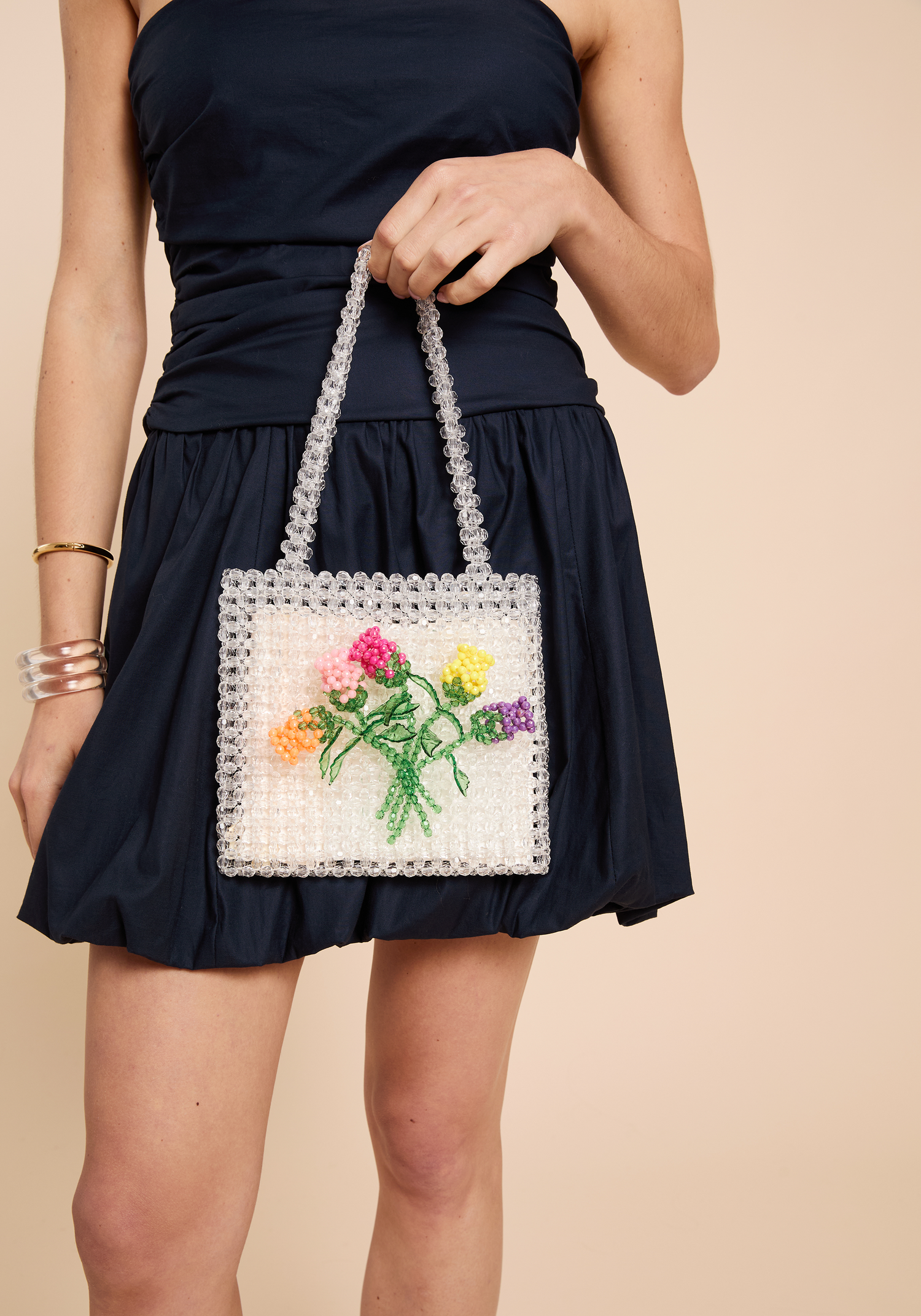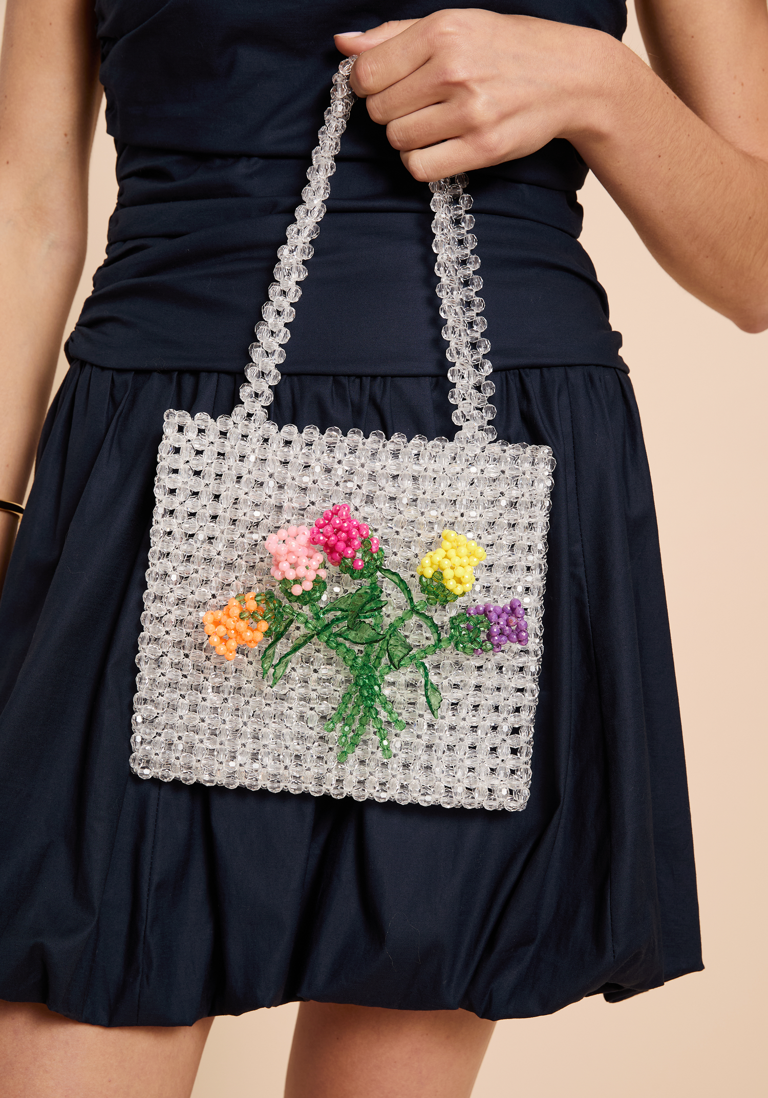The Fleuris Beaded Bag has a clear beaded base adorned with a vibrant floral design featuring five intricately crafted roses made from bright beads. This unique accessory combines expert craftsmanship with a playful aesthetic, making it a standout piece for those seeking a touch of fun in their style.