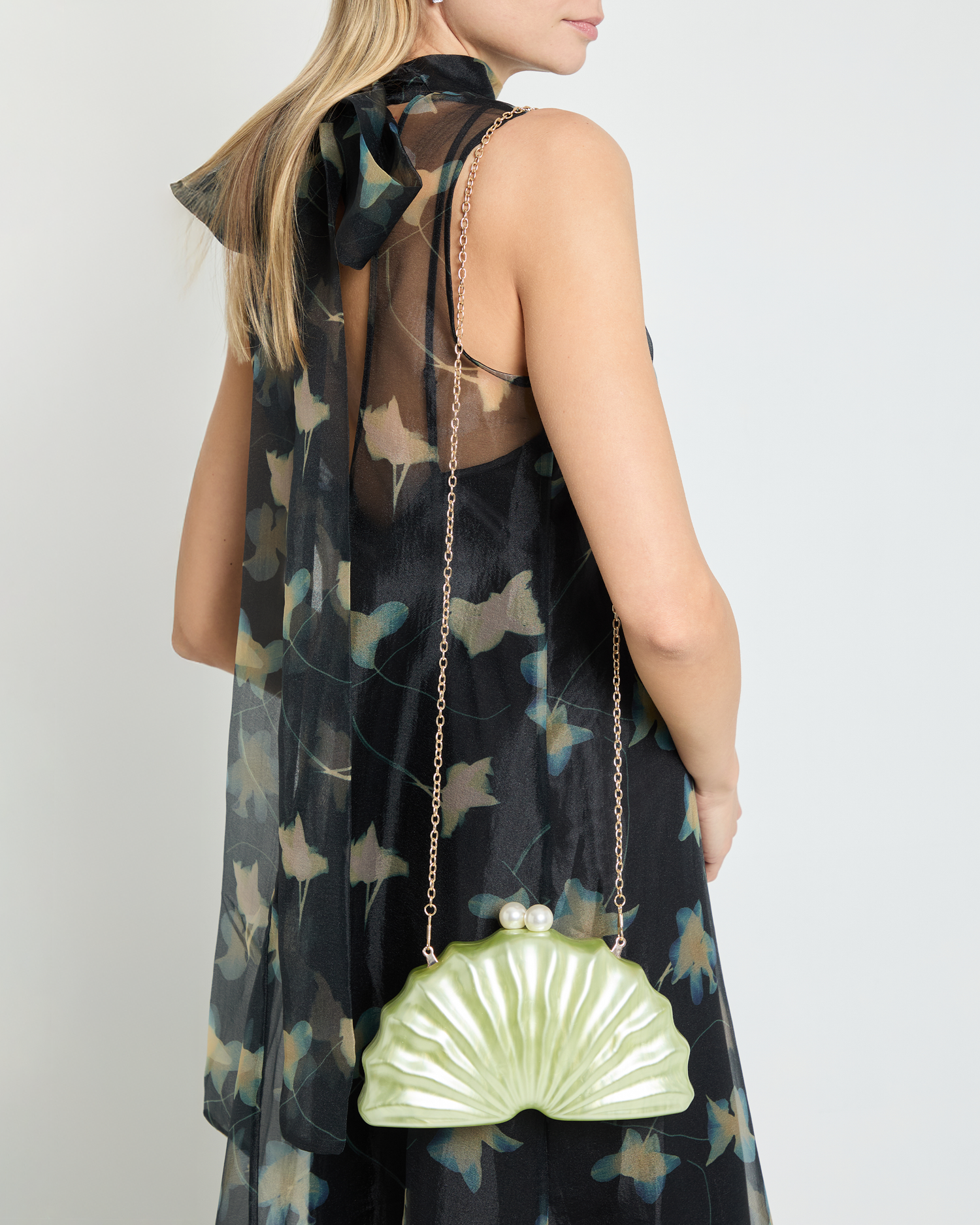 The Maris Shell Acrylic Clutch boasts a luminescent, sculptural design inspired by the unique shape of a seashell. Perfect for special occasions, this clutch adds an elegant touch to any outfit.