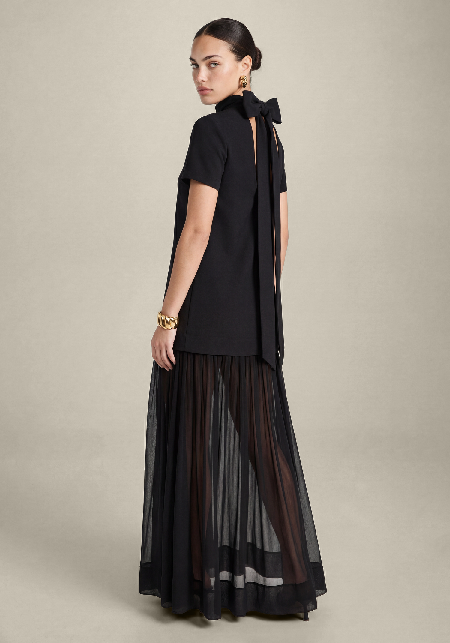 The Elowen Dress combines an elegant structured bodice with a sheer, flowy chiffon skirt for a refined and elevated look. Its delicate back bow detail adds a sophisticated finishing touch, making it an ideal choice for formal events and special occasions.