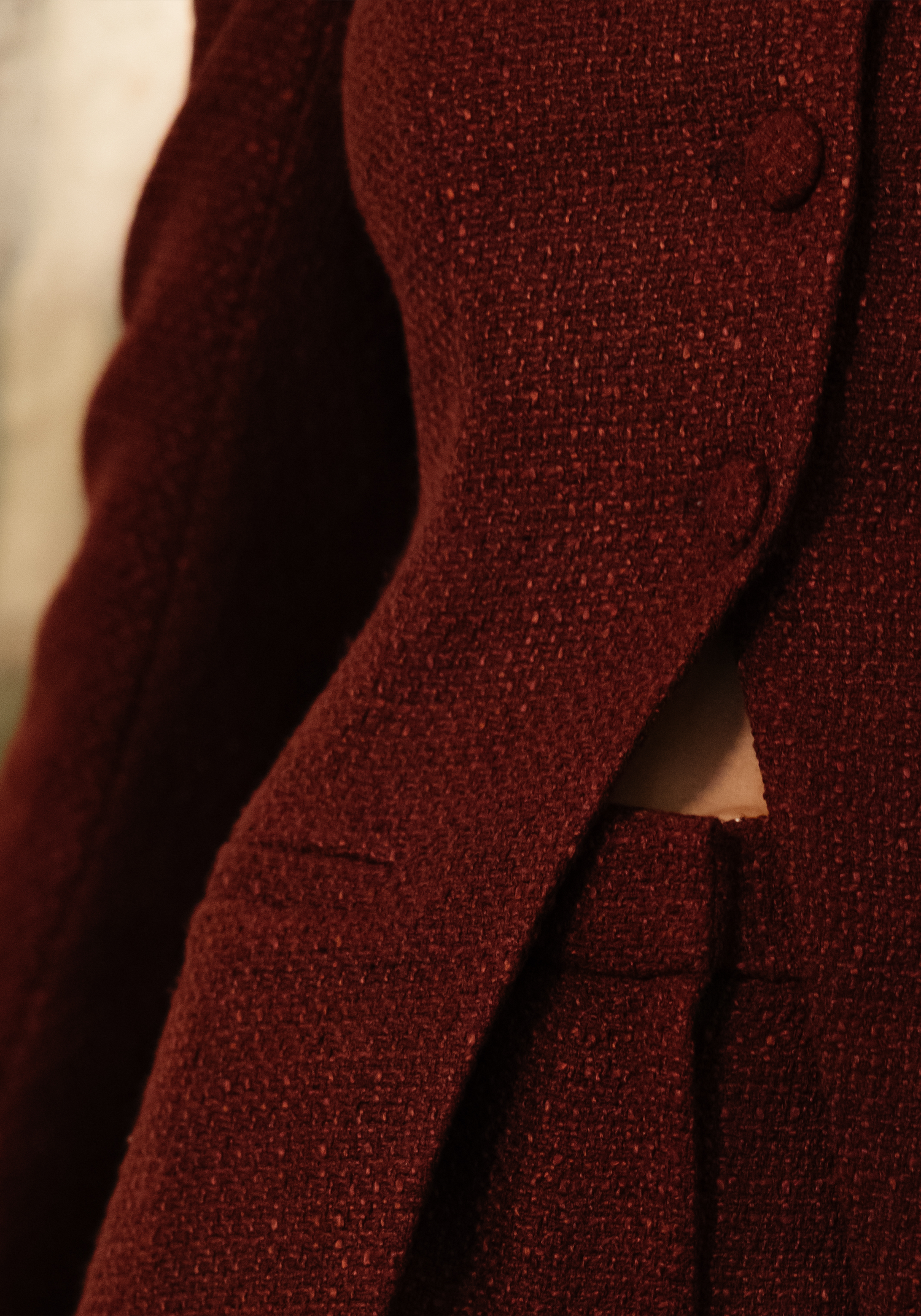 The Aperitivo Jacket is tailored from sumptuous burgundy tweed, delivering a structured look that embodies sophistication. Perfectly designed to dress up any outfit or effortlessly enhance your everyday style, this jacket combines classic elegance with modern versatility for a polished, refined appearance.