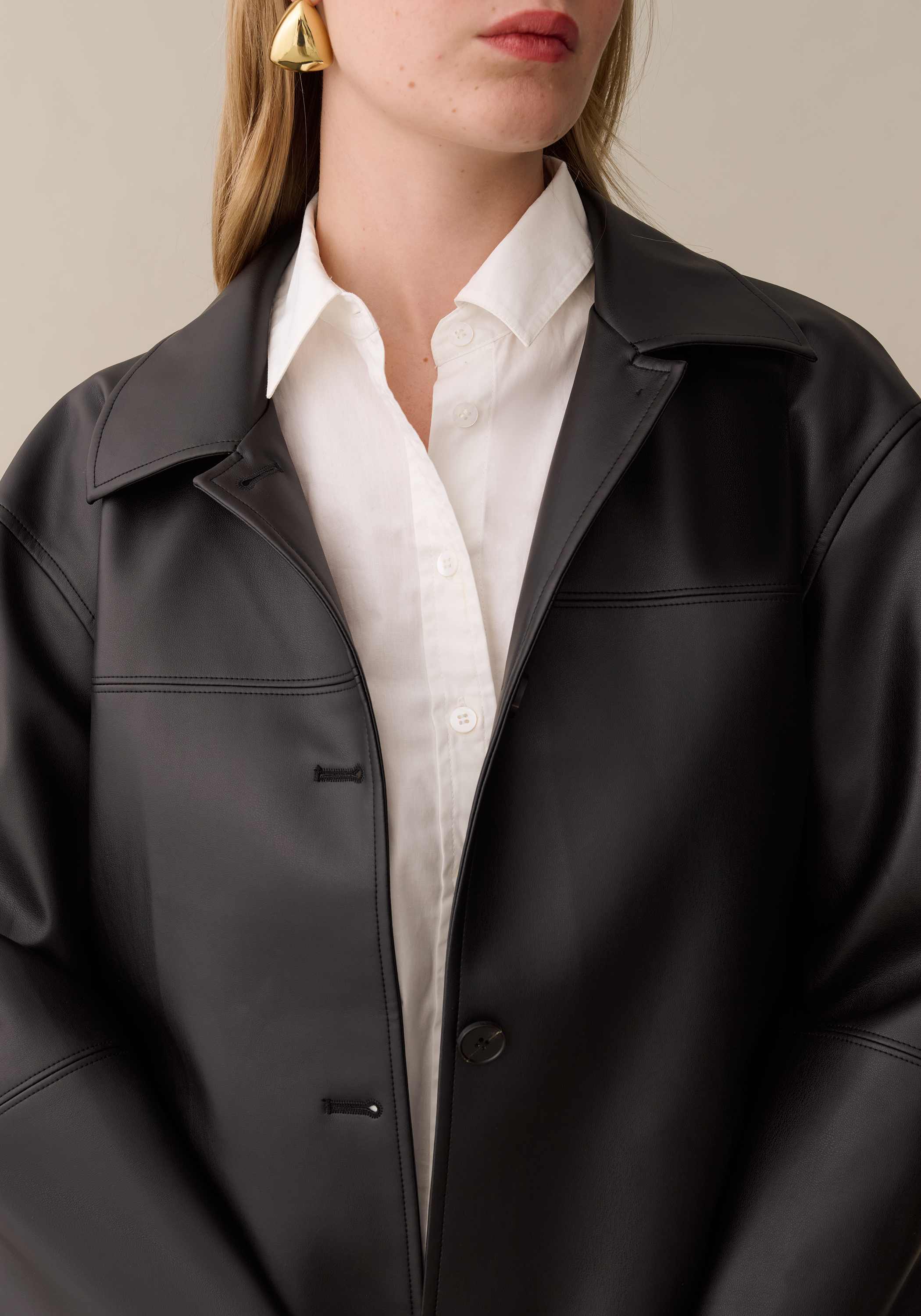 The Tova Jacket offers a lightweight layer crafted from cool faux leather, featuring a classic collar and front button closure. Designed as a versatile staple, it effortlessly elevates everyday outfits while providing comfortable, easy wear for transitional weather.