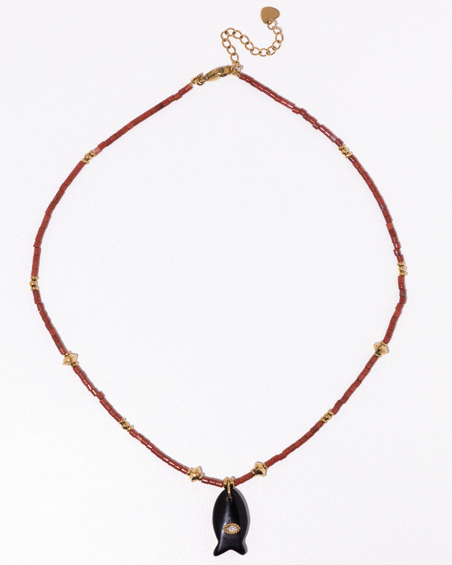 This Beaded Fish Pendant Necklace combines flecks of gold with multicolored beads and a subtle touch of red, capturing the essence of contemporary boho style. Its adjustable design ensures a comfortable fit, making it a versatile accessory that effortlessly complements both casual and curated outfits with a trendy, artistic flair.