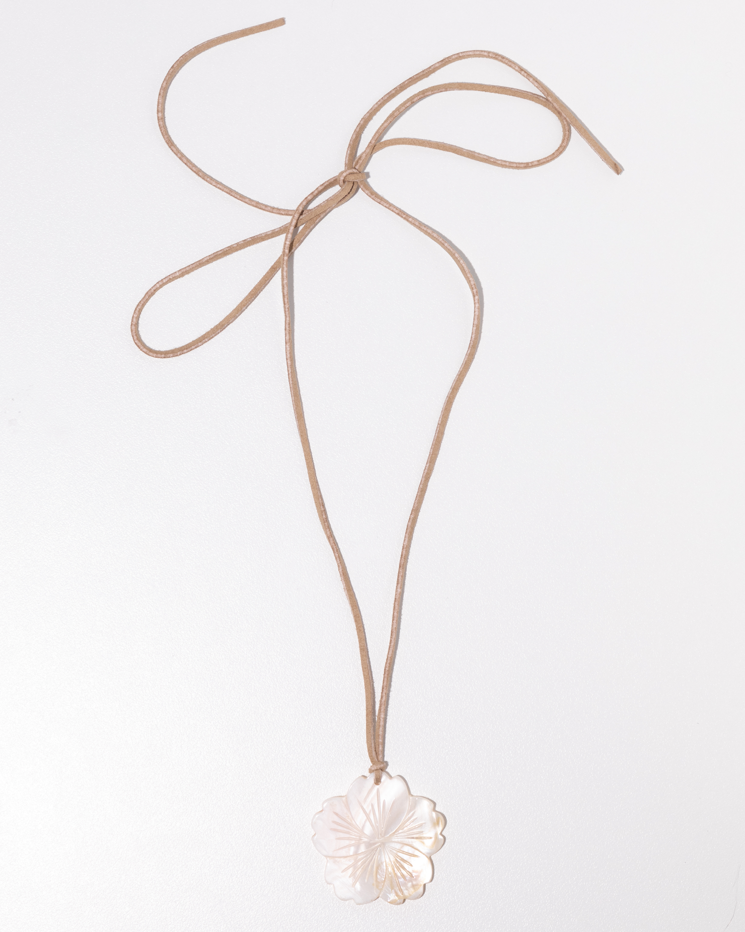 The Shell Flower Pendant Necklace features a delicately carved flower crafted from lustrous shell, offering a subtle natural sheen. Its neutral tones and elegant design create a versatile accessory that pairs effortlessly with any outfit.