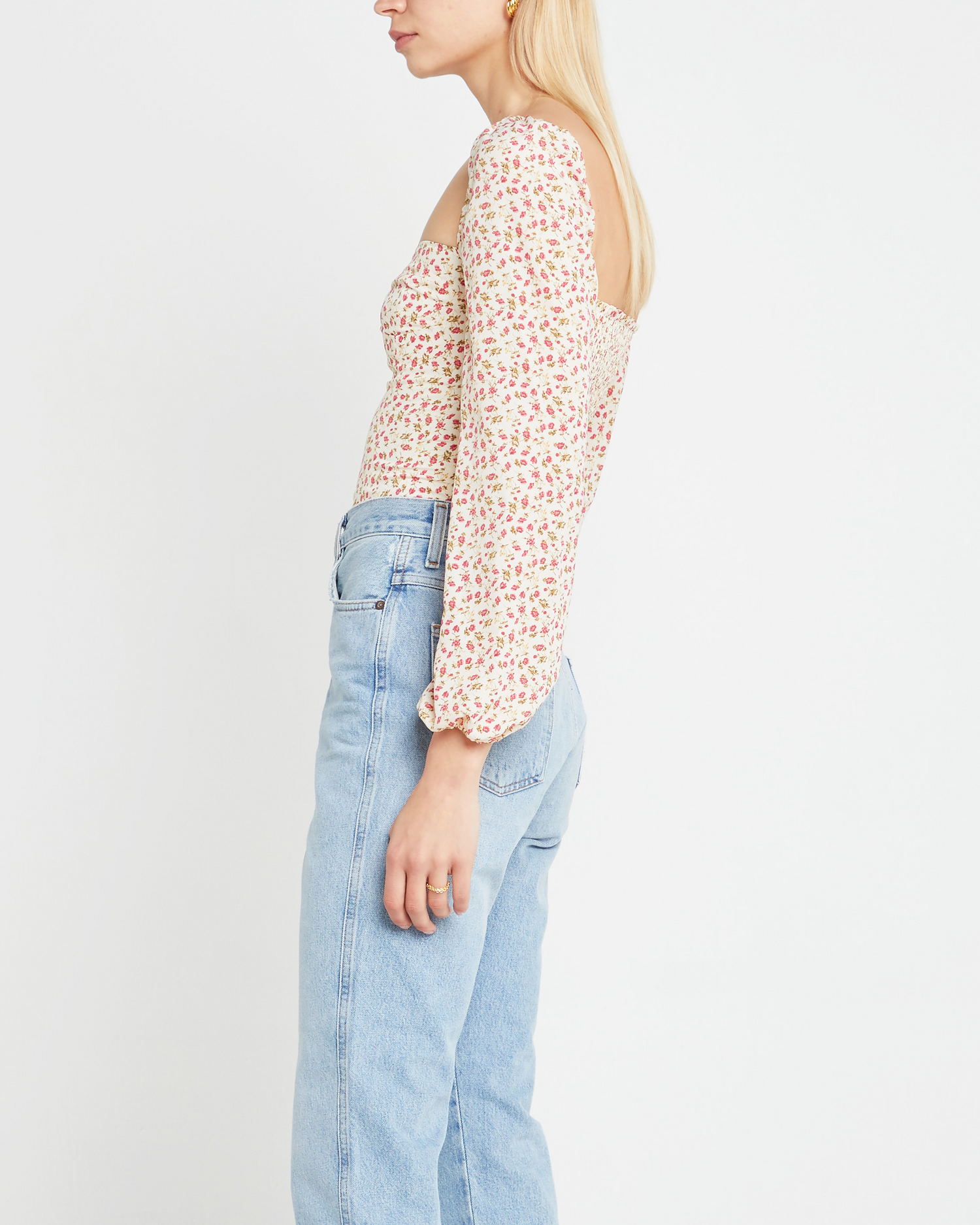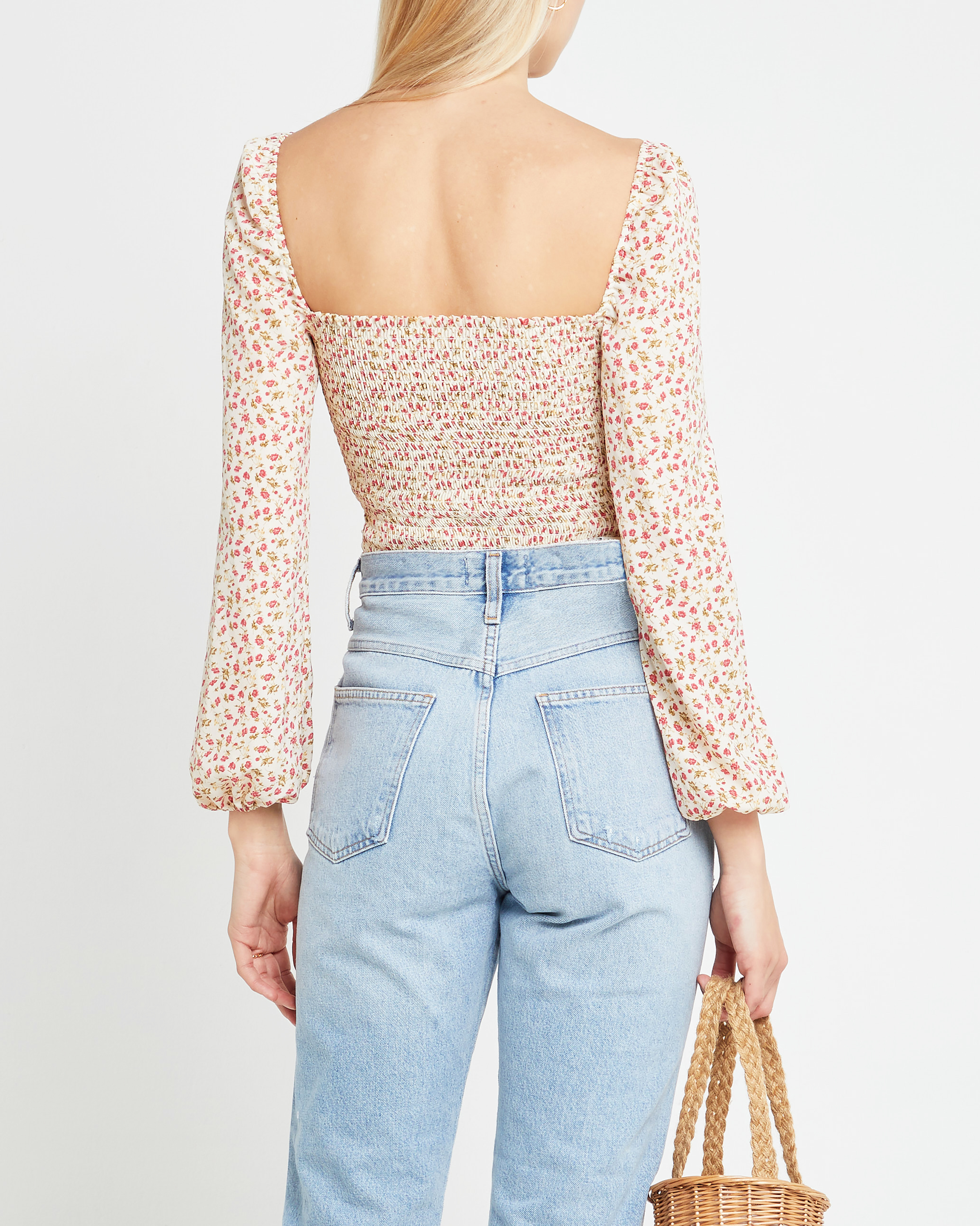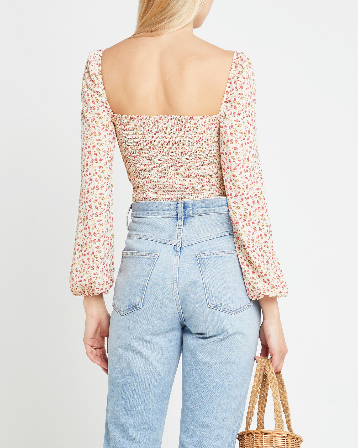 The bustier style bodice of this cool top pairs perfectly with the puff sleeves to create a flattering silhouette. Finished with back smocking.