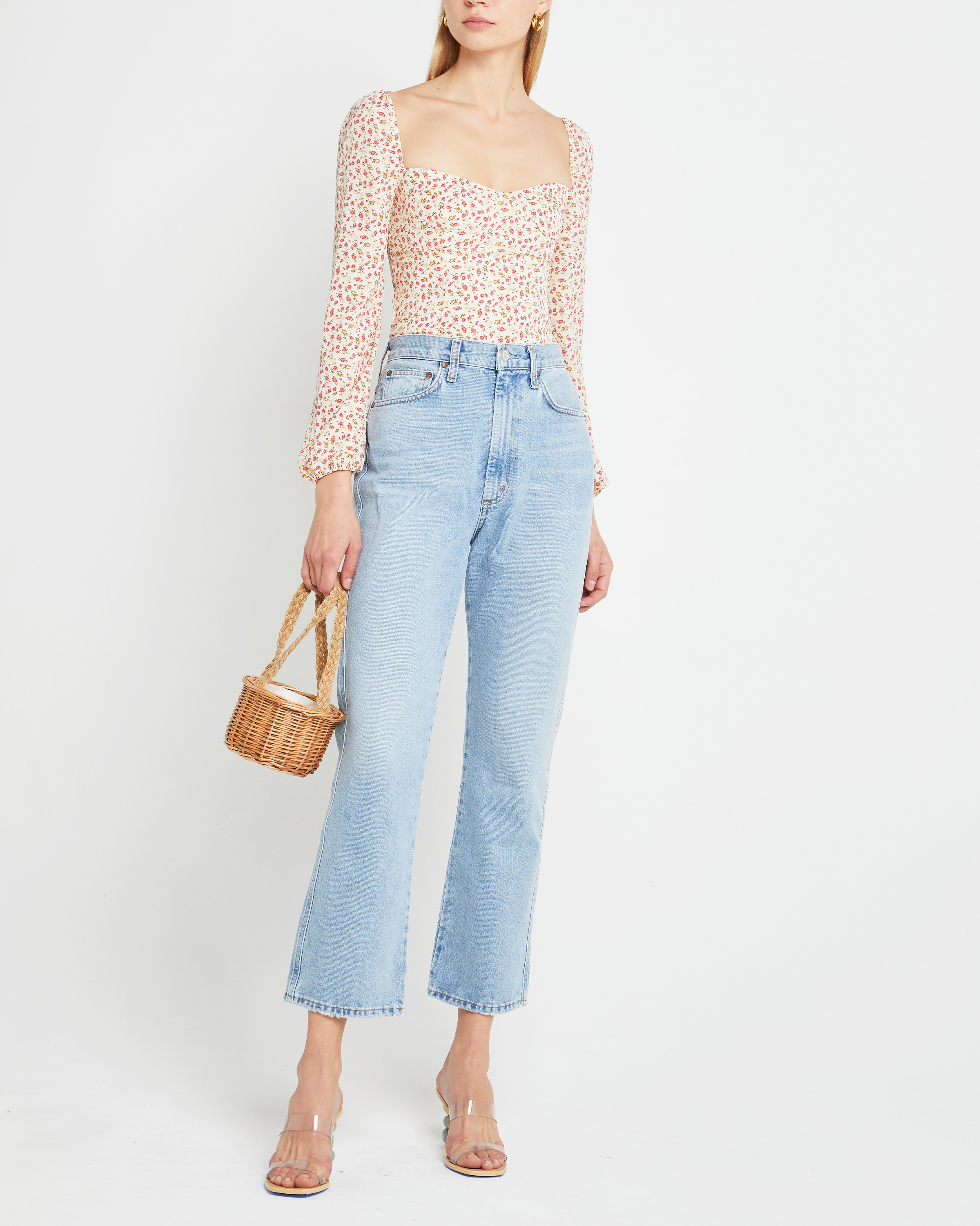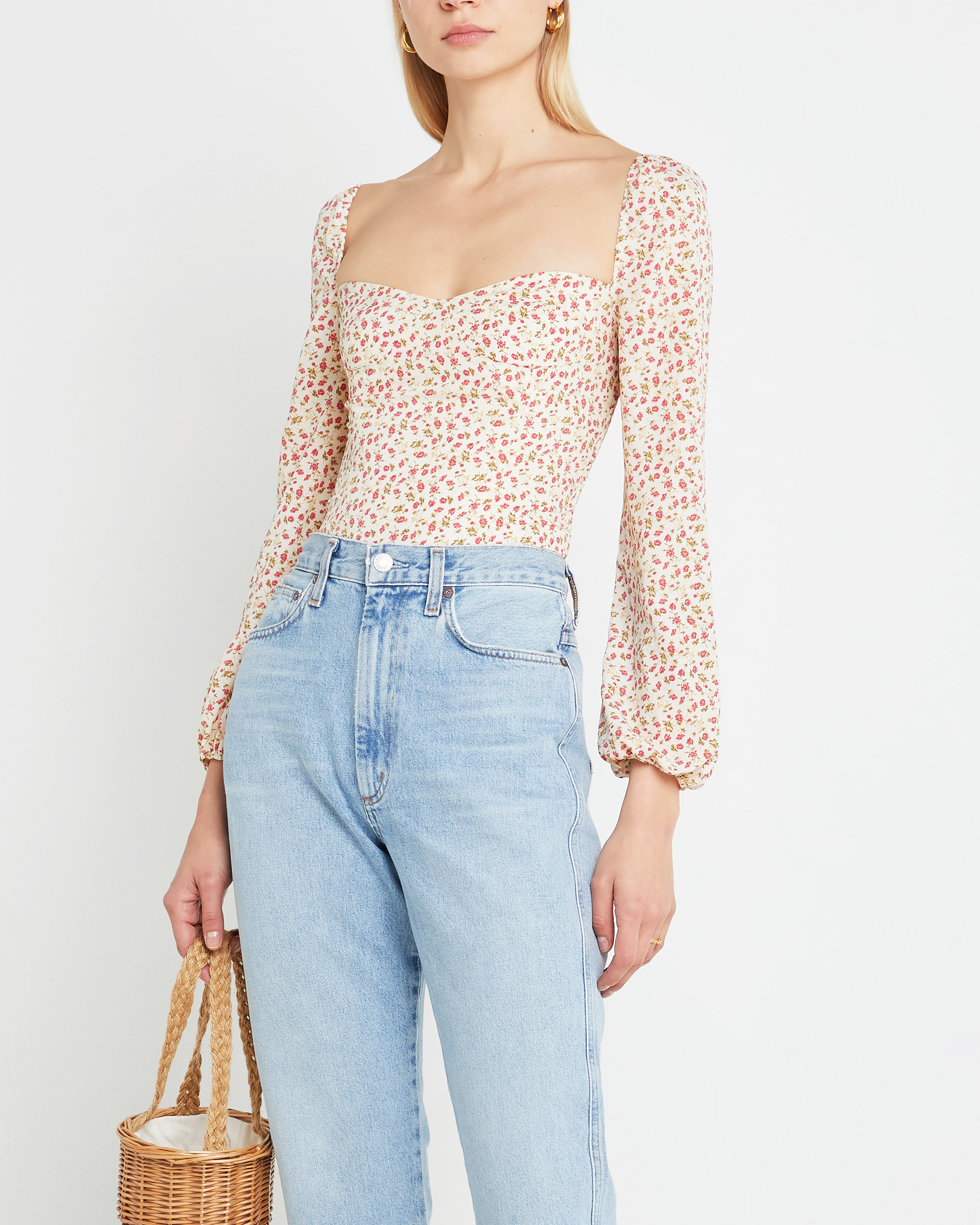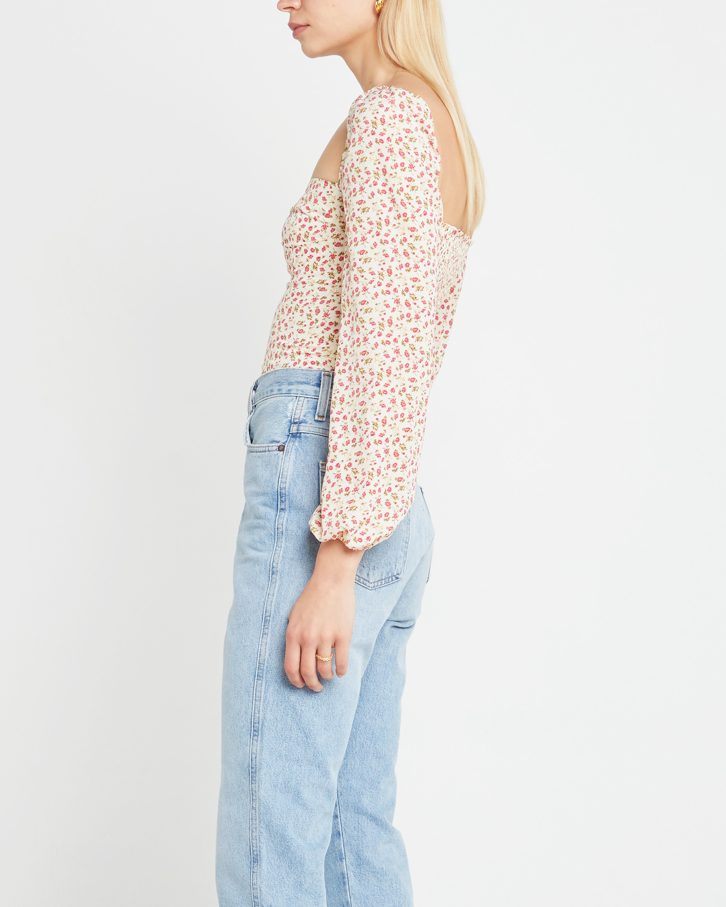 The bustier style bodice of this cool top pairs perfectly with the puff sleeves to create a flattering silhouette. Finished with back smocking.
