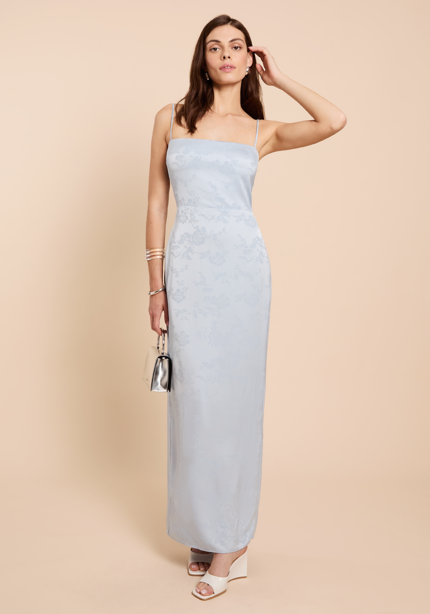 The Calla Dress is crafted from floral jacquard fabric that features a subtle shine, highlighting its soft and sweet hue. Its simple column silhouette creates a sleek, chic look, perfect for those seeking understated elegance with a refined touch.