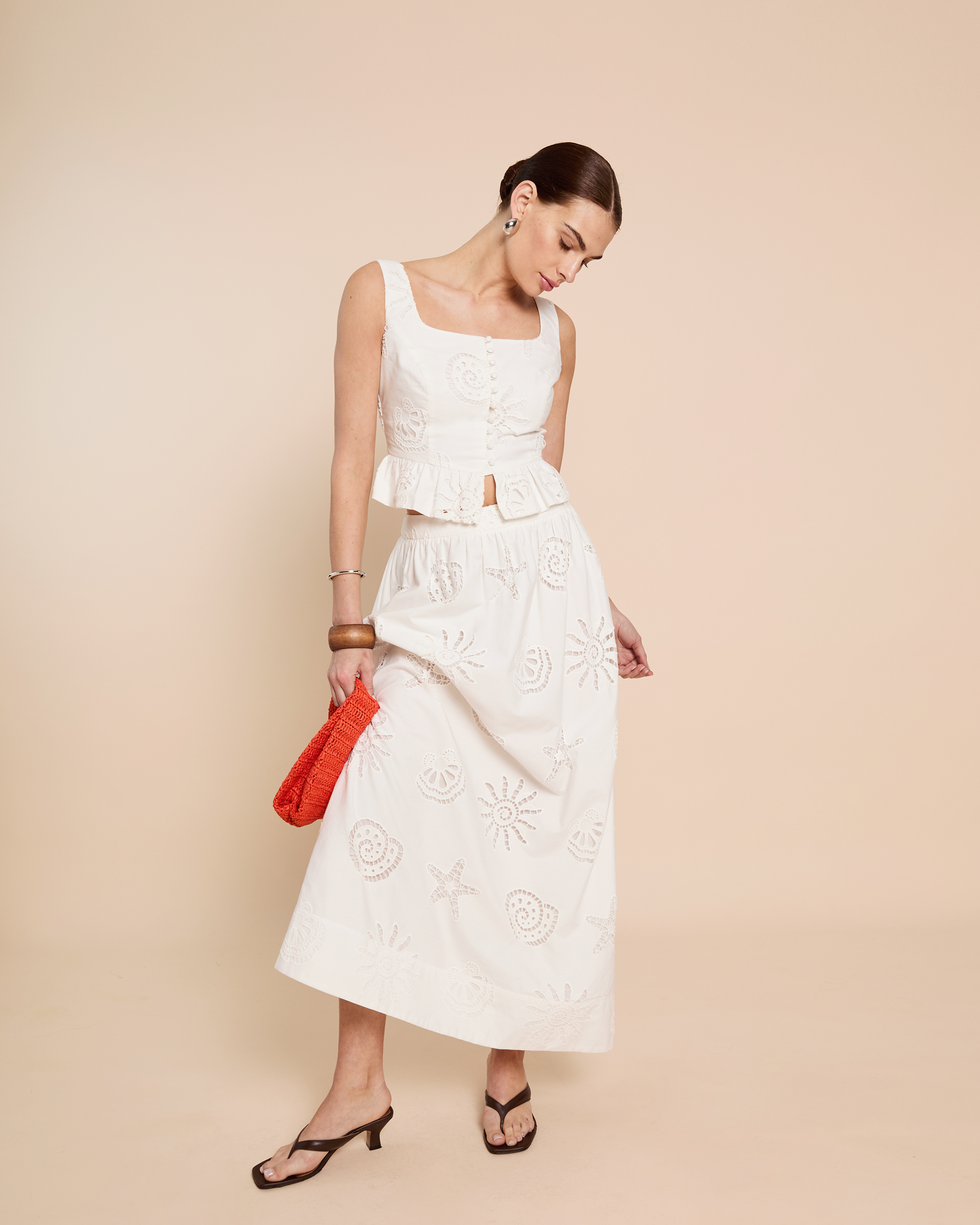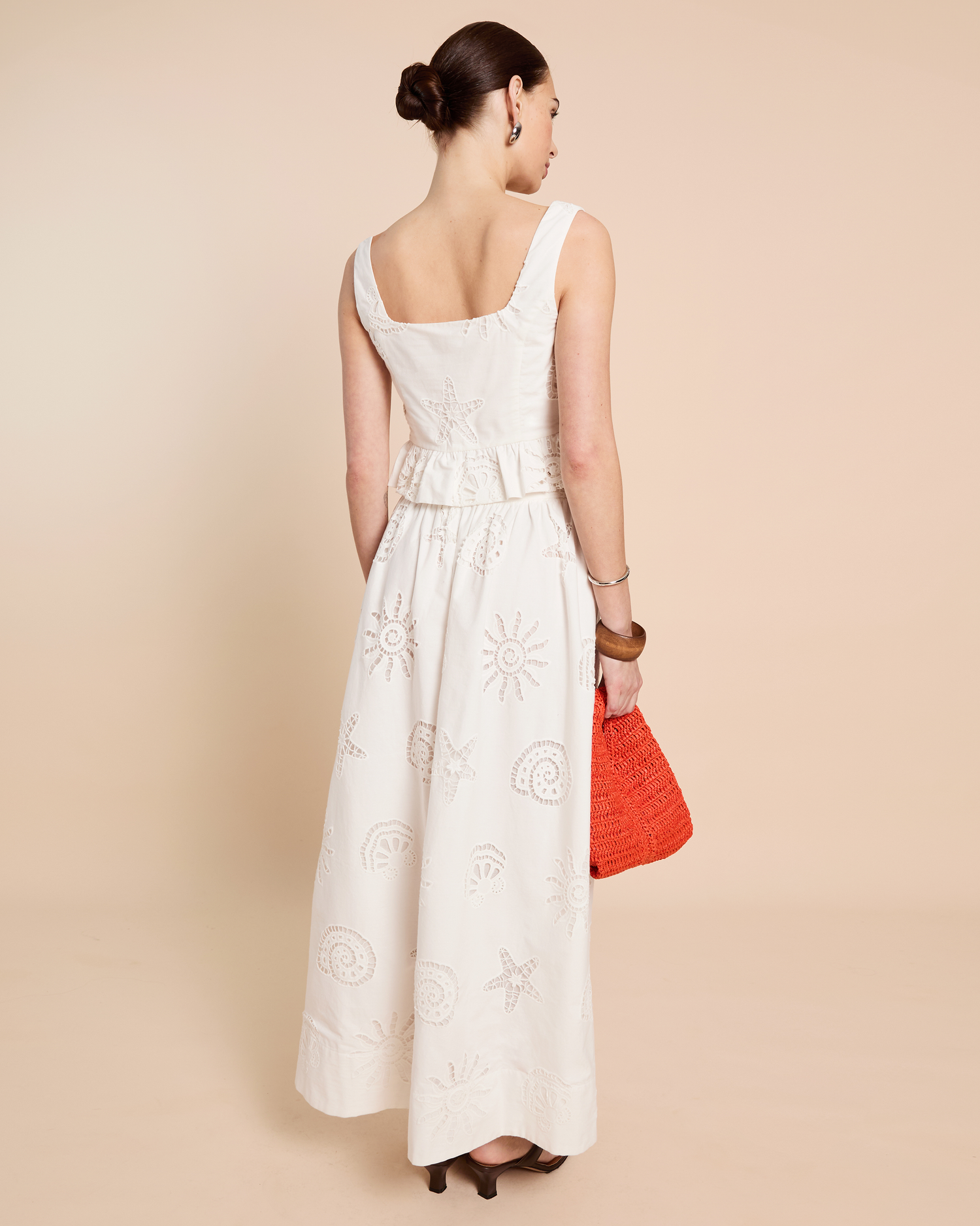 The Celeste Cotton Set combines structural elegance with summer comfort. The top features a tailored silhouette with a delicate peplum detail. Finished with a flowing maxi skirt crafted from 100% cotton with a fun, eyelet lace pattern.