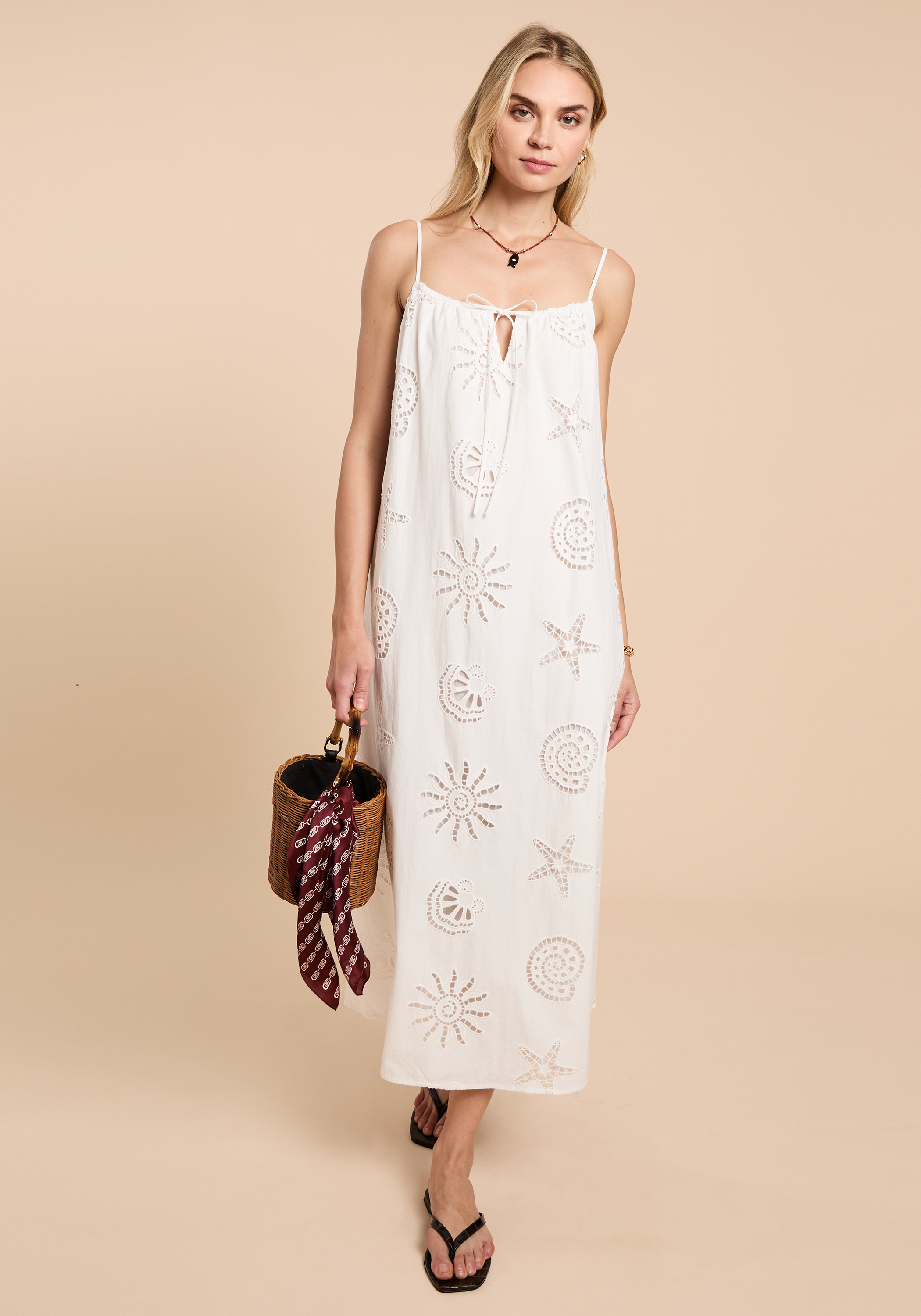 The Genevieve Cotton Dress offers a comfortable, relaxed fit crafted from fresh, summery white eyelet cotton. Featuring a delicate tie detail at the neck, this dress combines effortless style with breathable comfort, making it an ideal choice for warm-weather days.