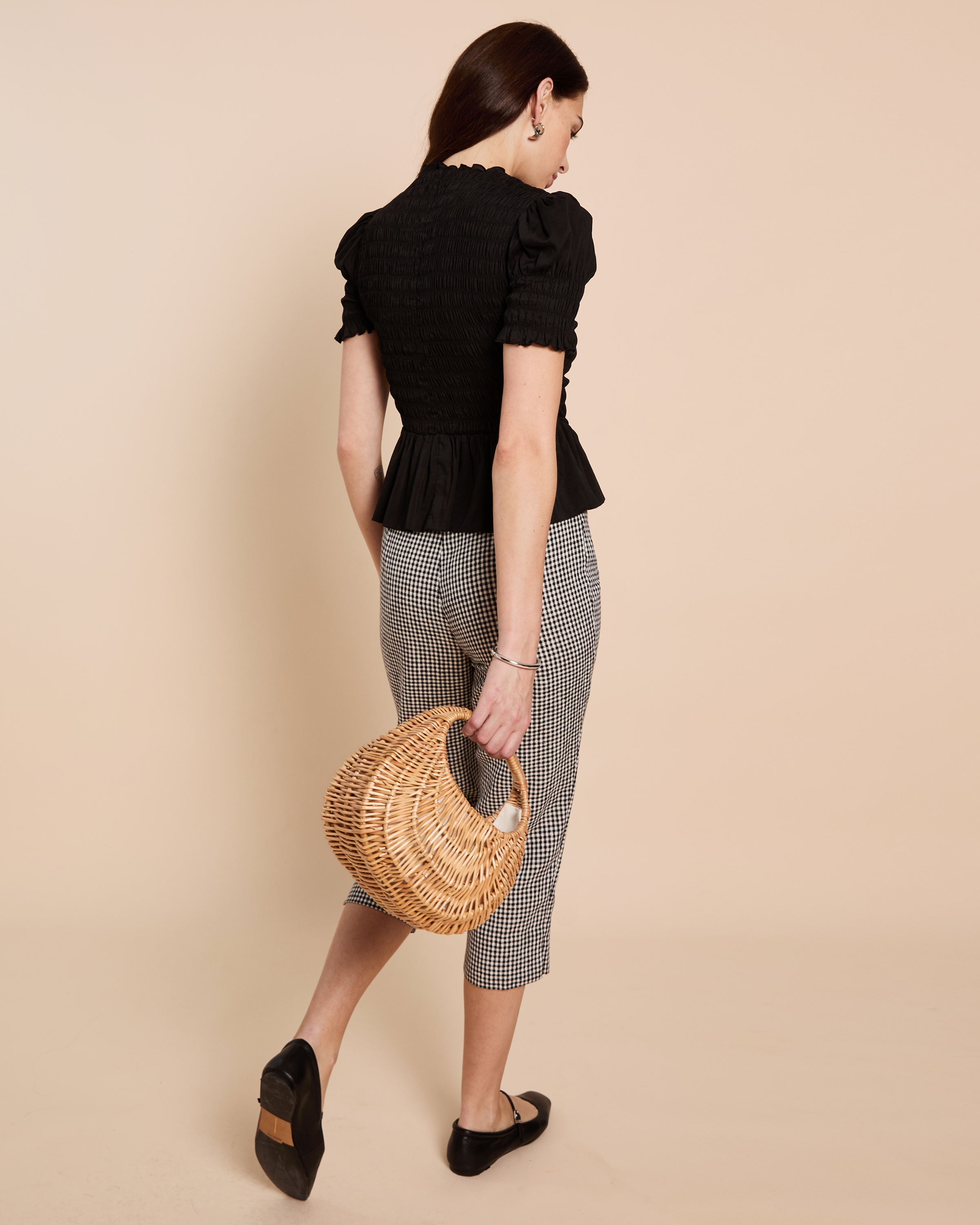 The flattering peplum silhouette creates a defined waistline while the stretchy smocked bodice delivers a comfortable, tailored fit that moves with you. Subtle puff sleeves add a charming touch, complemented by a chic high neckline making this piece truly versatile.