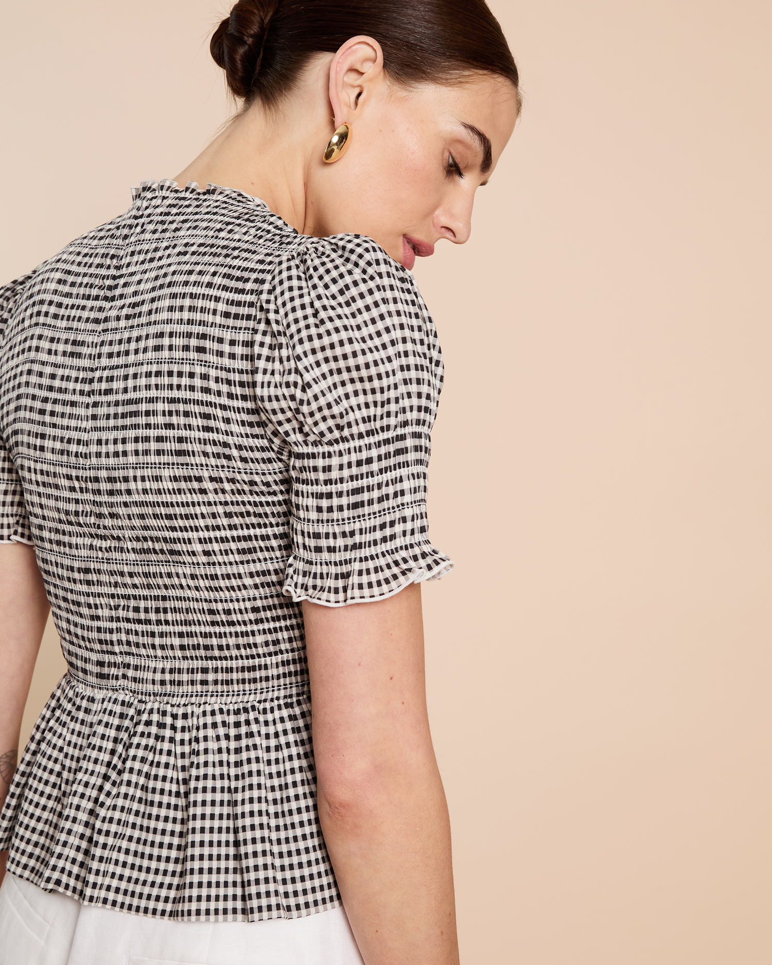 The flattering peplum silhouette creates a defined waistline while the stretchy smocked bodice delivers a comfortable, tailored fit that moves with you. Subtle puff sleeves add a charming touch, complemented by a chic high neckline making this piece truly versatile.
