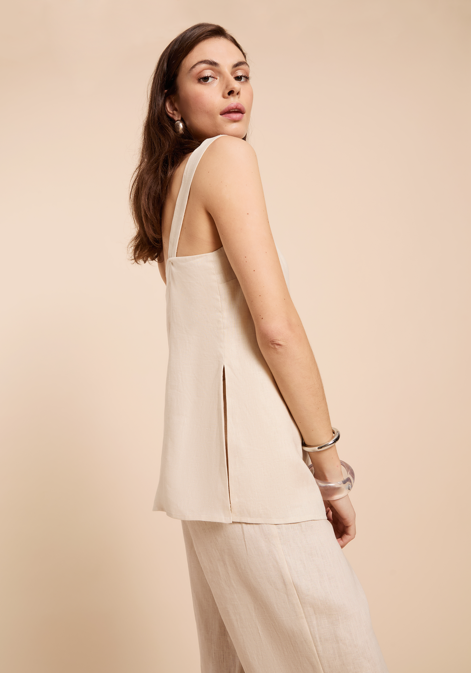 Crafted from natural linen, the Circe Linen Set features elegant side slit details and a distinctive square neckline, blending modern design with timeless sophistication. Making it an ideal choice for those seeking a chic yet effortless look.