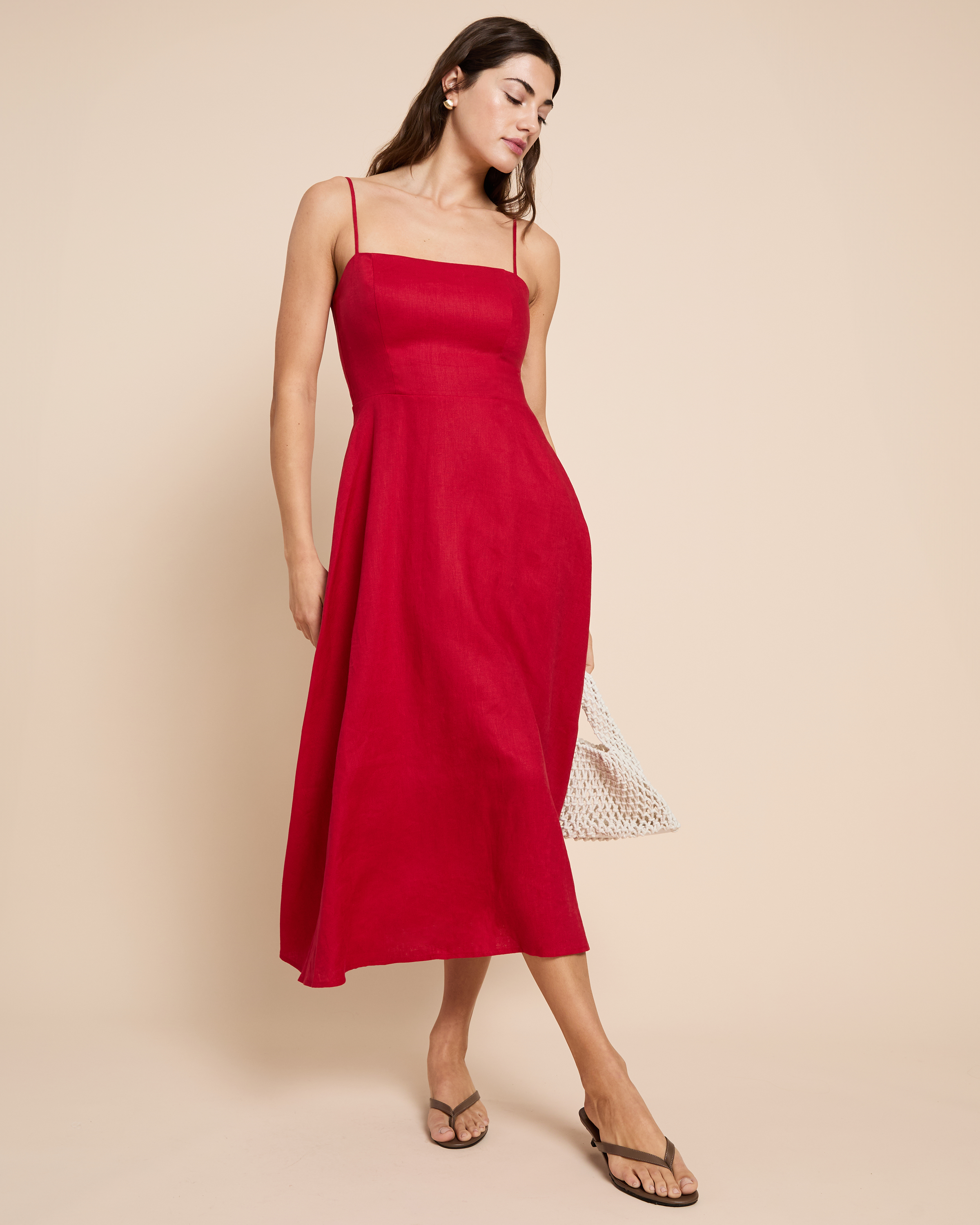 Effortlessly elevate your wardrobe with the Khalani Dress. Made with fresh, lightweight linen, this dress boasts thin straps and a straight neckline for a sophisticated look. The elegant full skirt adds a touch of effortless charm. Perfect for any occasion.
