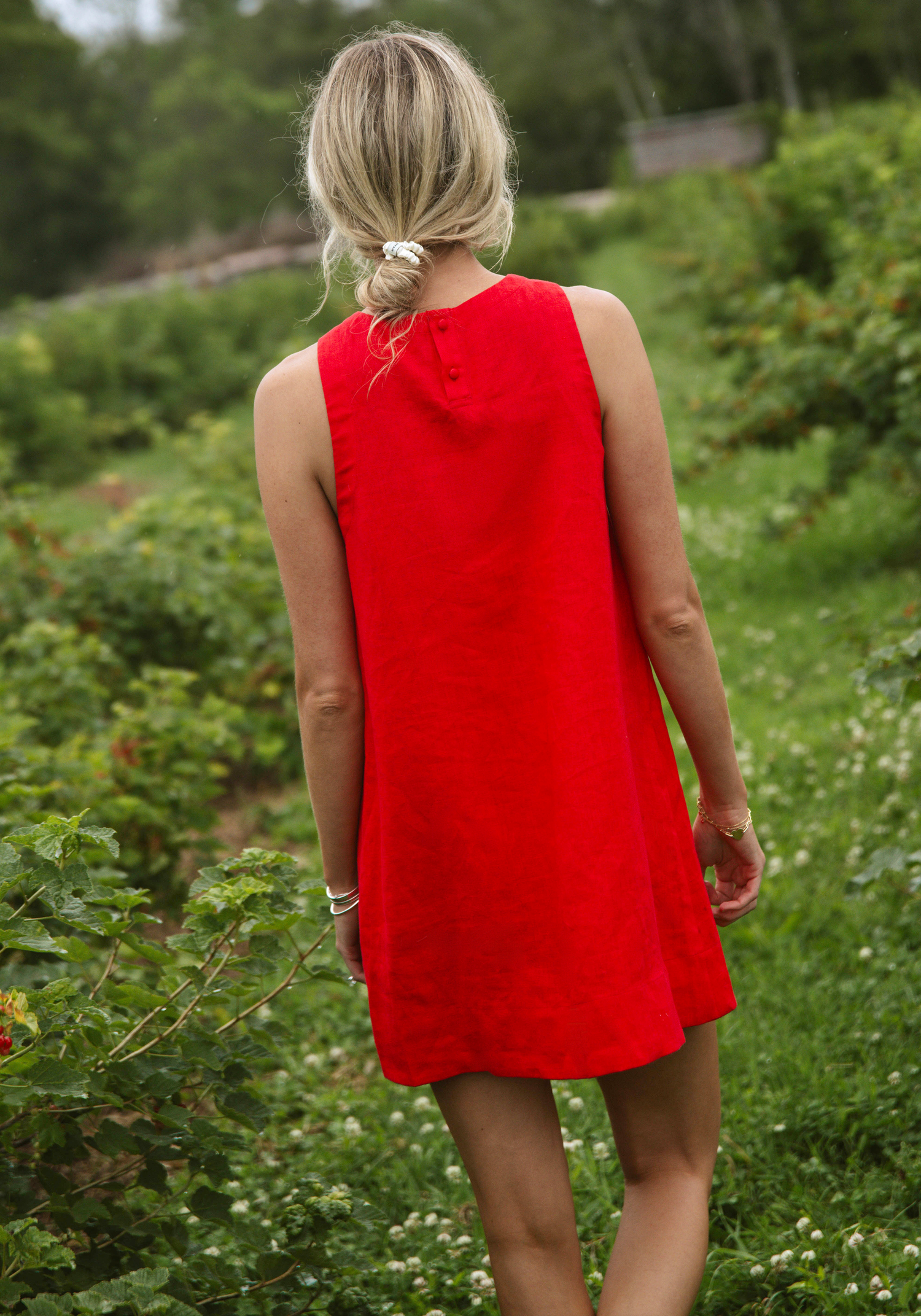The Zinnia Linen Mini Dress features a relaxed fit and an easy swing silhouette, crafted from fresh red linen for breathable comfort. Its simple, timeless design offers effortless style, making it a truly versatile piece.