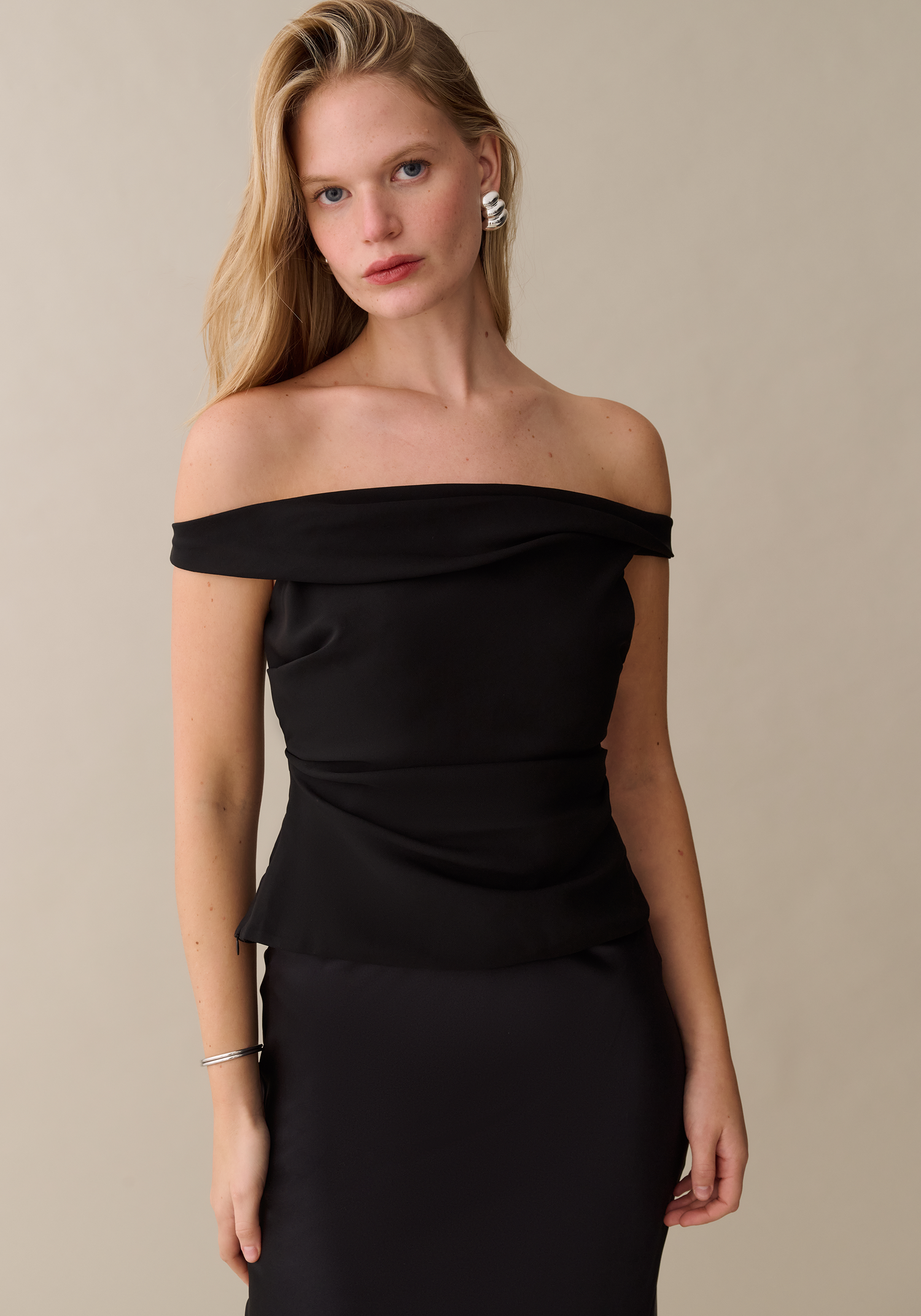 The Alina Top features an elegant off-the-shoulder design with comfortable elastic details for a secure and flexible fit. Crafted from thick, high-quality material, this fitted top offers flattering ruching that contours the silhouette, providing both style and comfort throughout the day.