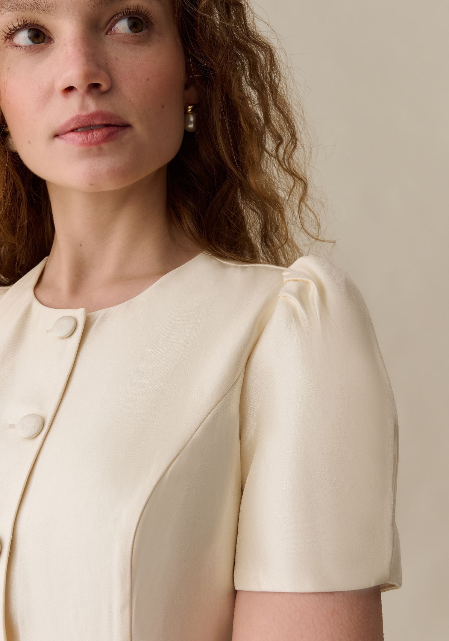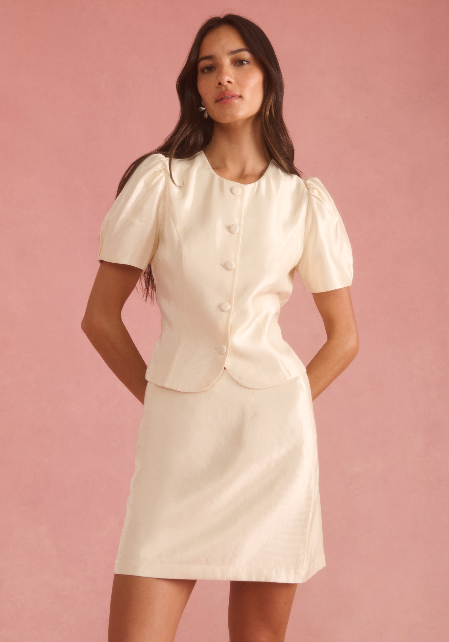 This tailored set channels timeless sophistication with its fitted silhouette and subtle structure. The short-sleeve jacket features covered buttons and gentle gathers at the shoulders, paired with a clean, minimal mini skirt. Understated yet elegant, it’s a polished ensemble perfect for modern occasions.
