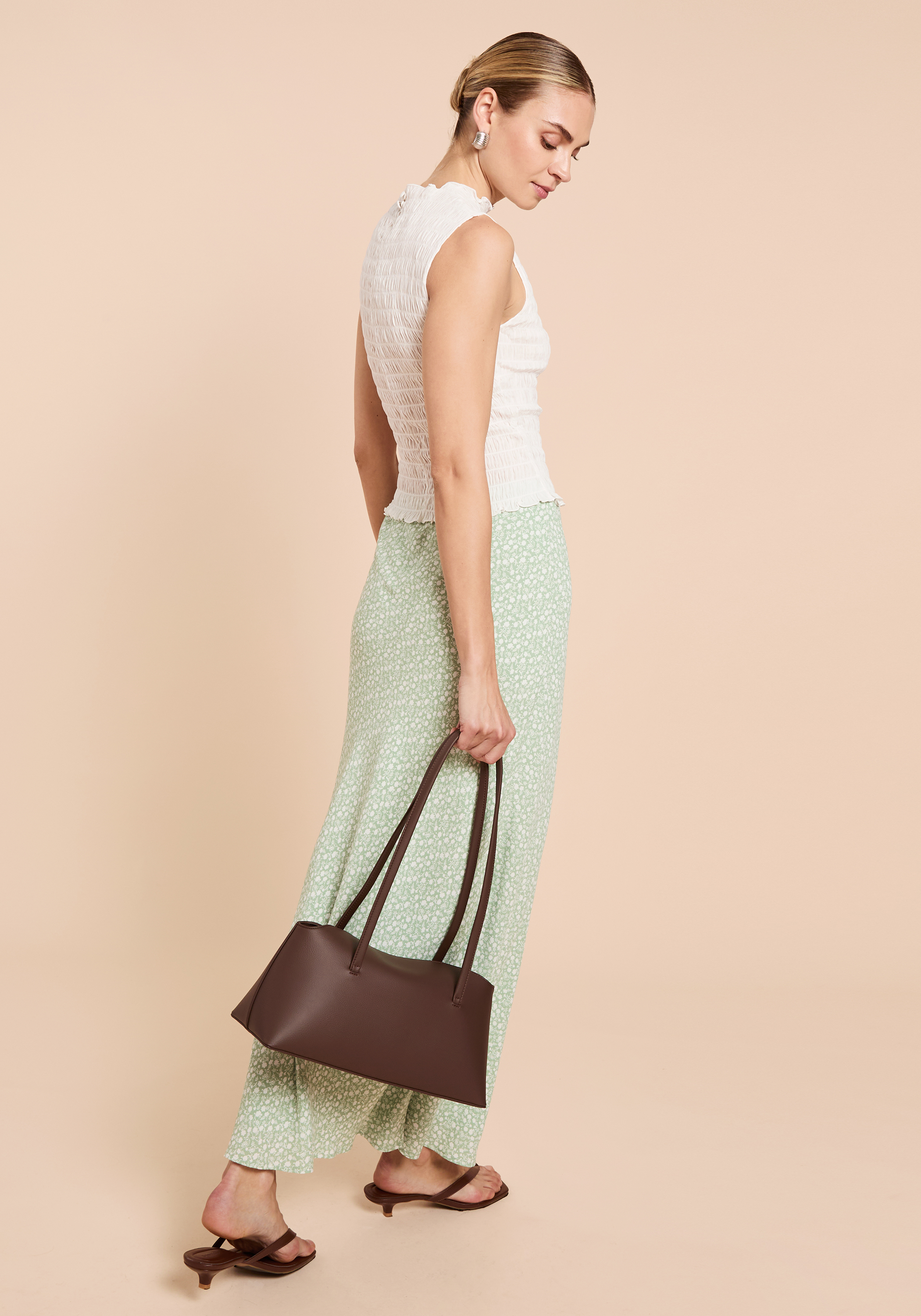 The Reece Skirt features a soft green floral pattern and a comfortable elastic waist, offering effortless style and versatility. Its maxi length makes it ideal for both casual and dressier occasions, allowing you to easily transition your look from day to night.